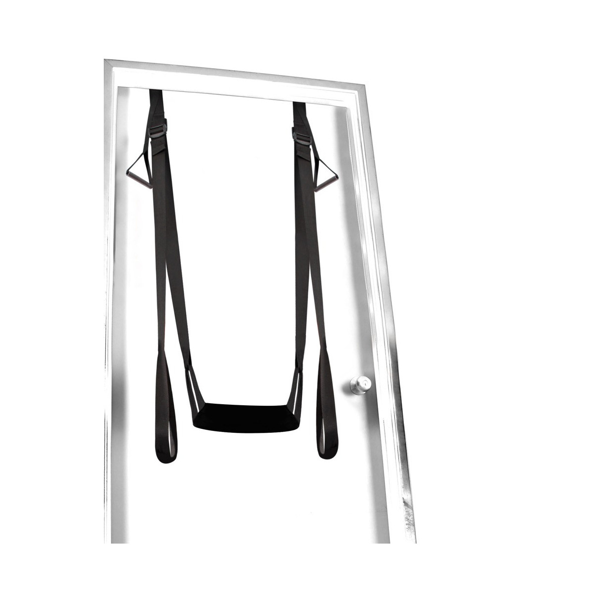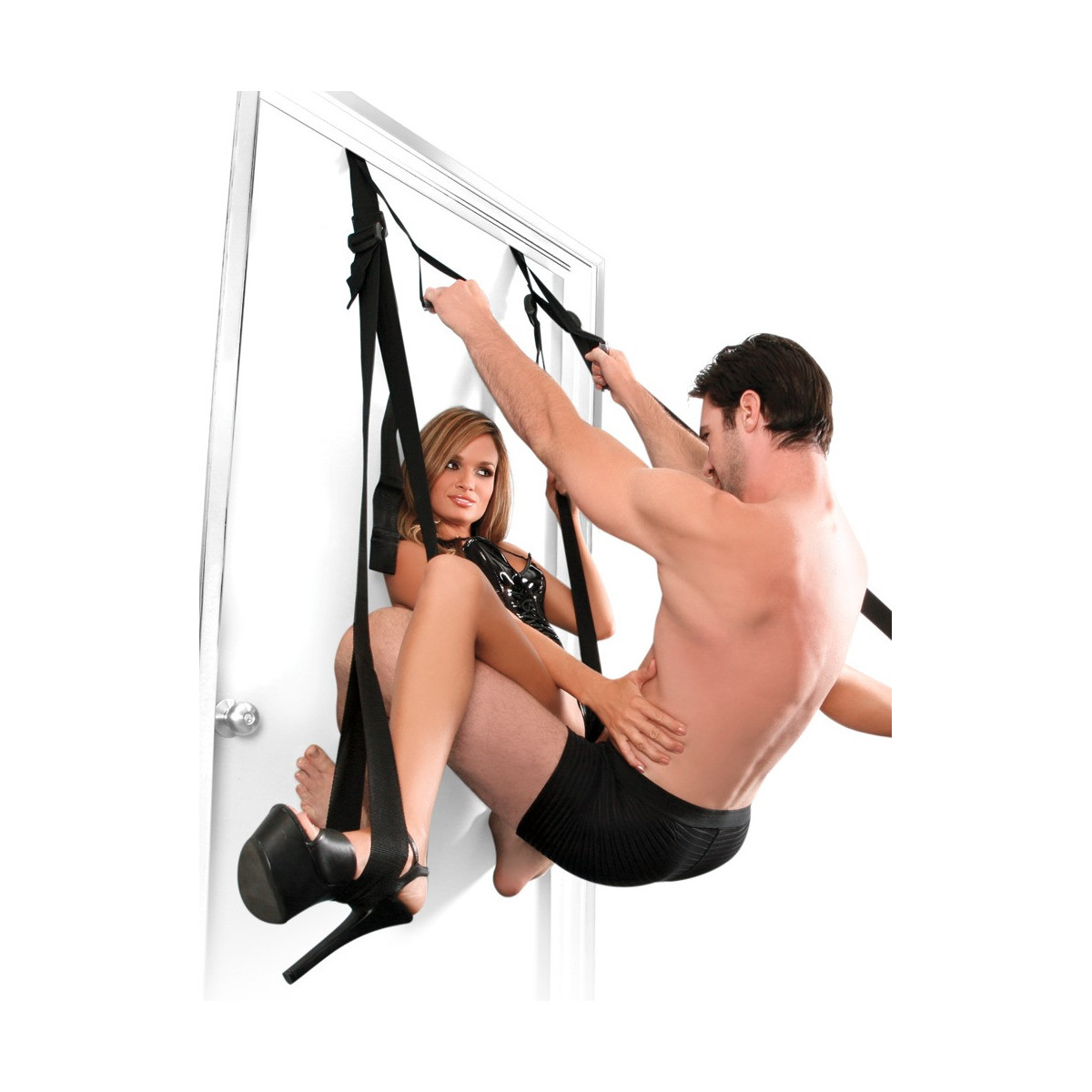 Altalena dell'amore da attaccare alla porta. Non è necessario il montaggio. Composto da due cinghie nere, multiregolabili, con passanti per le gambe su due aste in acrilico, nonché da un guscio del sedile imbottito e passanti per le mani. Può essere caricato fino a 136 kg. Compresa la maschera per gli occhi.