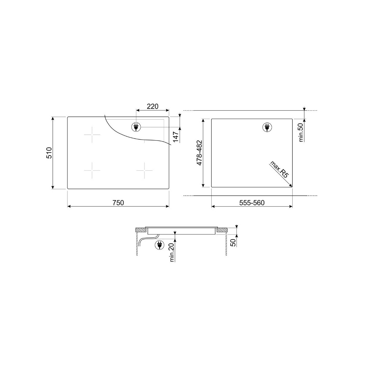 Smeg SIB2741D. Colore del prodotto: Nero, Posizionamento dell'apparecchio: Da incasso, Dimensione della larghezza del piano cottura: 75 cm. Bruciatore piccolo: 1850 W, Bruciatore medio: 2300 W, Zona di cottura/fornello a fuoco lento a piena potenza: 2100 W. Tipo di controllo: Touch, Posizione di controllo: Frontale superiore, Tipo di timer: Digitale. Potenza aggregata (elettrica): 7200 W, Tensione di ingresso AC: 220 - 240 V, Frequenza di ingresso AC: 50/60 Hz. Larghezza: 750 mm, Profondità: 510 mm, Altezza: 56 mm