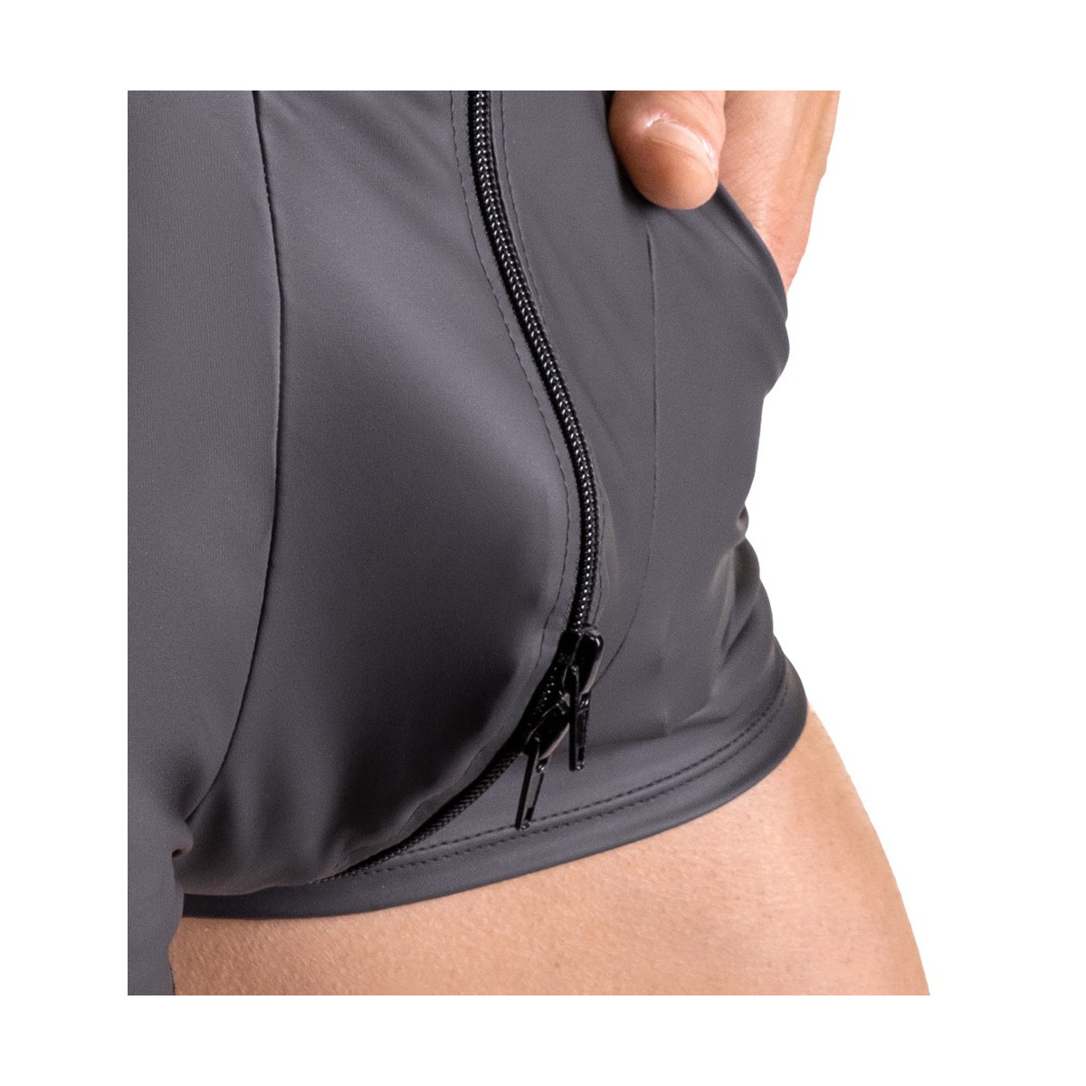 Tuta senza maniche di Svenjoyment con gamba corta e grandi tasche. Tagliato tutto intorno in un look nero opaco alla moda e aderente al corpo. Con zip a 3 vie lungo il collo, attraverso il cavallo e sopra il fondo. La qualità elastica si adatta perfettamente alla pelle ed è estremamente comoda da indossare.