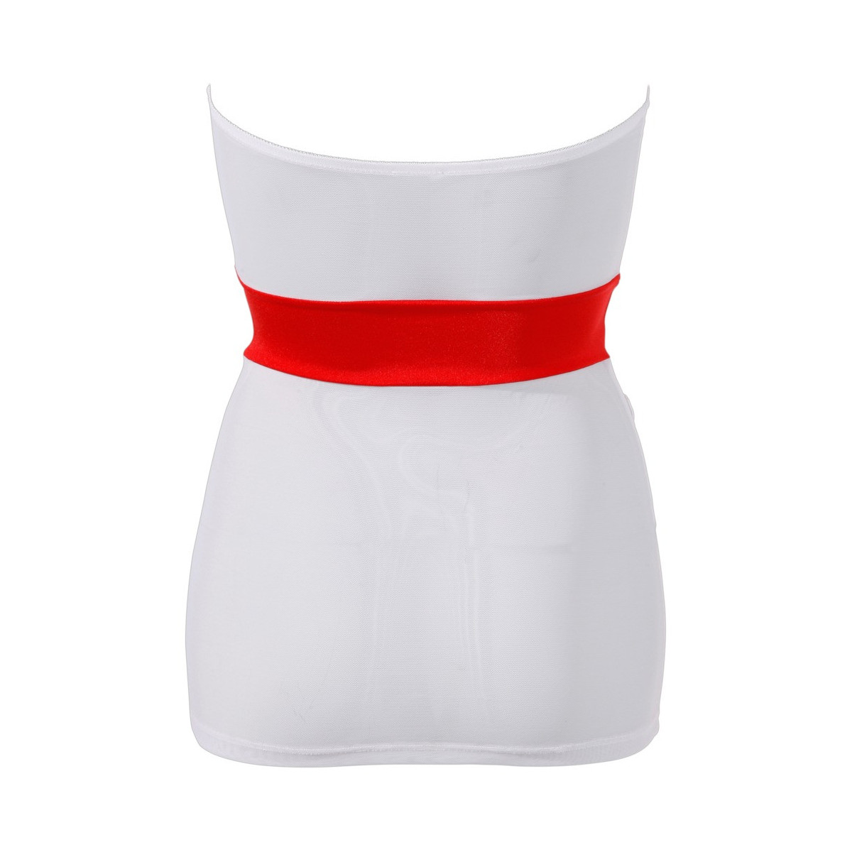 Seducente abito in powernet bianco con inserti rossi a forma di croce sul davanti. Una cerniera a tutta lunghezza conduce attraverso l'inserto allungato, l'inserto incrociato sottolinea la vita. Con piccole tasche sul davanti per stivare tutti i tipi di accessori, due bretelle e un collo halter nel collo per una schiena irresistibile. Il piccolo cerchietto bianco con volant rosso rende il look perfetto.