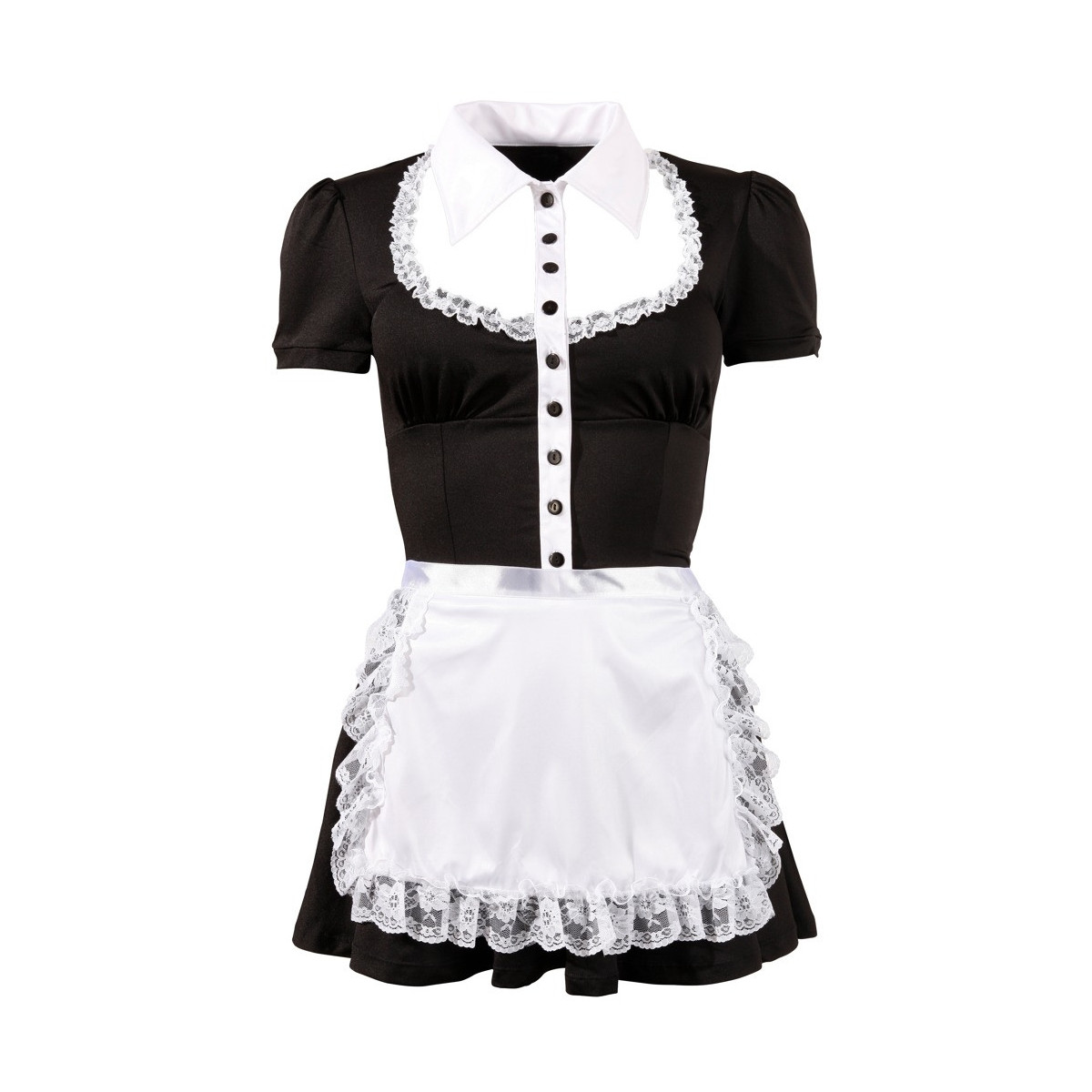 Dolce abito nero con colletto bianco, una fila di bottoni e balze decorative nella zona del décolleté. Include un grembiule bianco che si allaccia sul retro.
