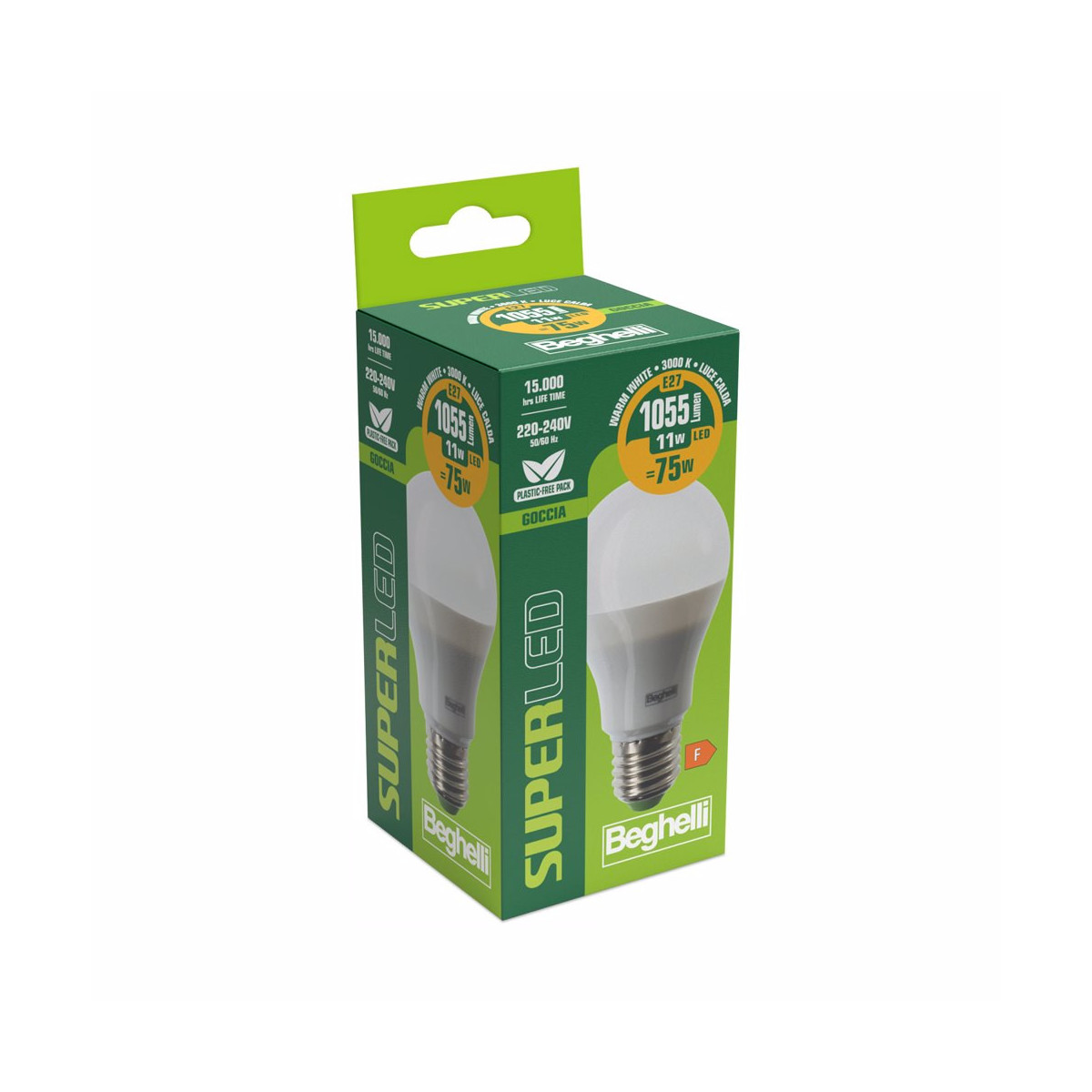 Beghelli SuperLED. Potenza lampadina: 11 W, Lampadina di potenza equivalente: 75 W, Attacco lampada: E27, Flusso luminoso: 1055 lm, Durata della lampadina: 15000 h, Colore della luce: Bianco caldo, Temperatura colore: 3000 K, Angolo proiezione: 270°, Color Rendering Index (CRI): 80, Fattore di potenza: 0,51