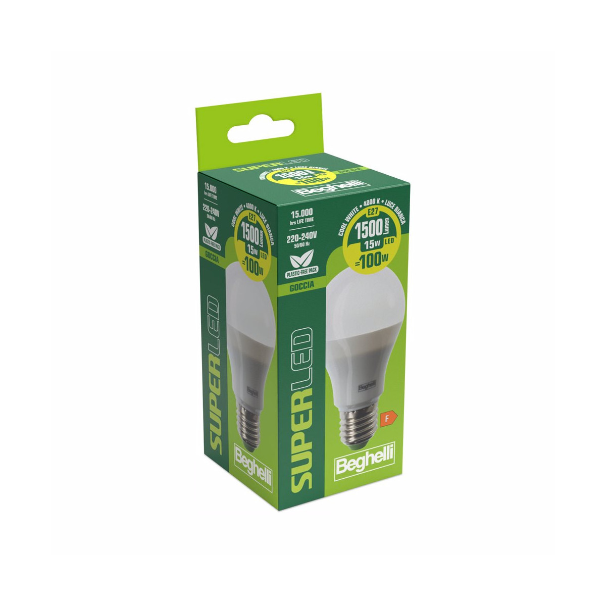 Beghelli SuperLED. Potenza lampadina: 15 W, Lampadina di potenza equivalente: 100 W, Attacco lampada: E27, Flusso luminoso: 1500 lm, Durata della lampadina: 15000 h, Colore della luce: Bianco neutro, Temperatura colore: 4000 K, Angolo proiezione: 270°, Color Rendering Index (CRI): 80, Fattore di potenza: 0,51