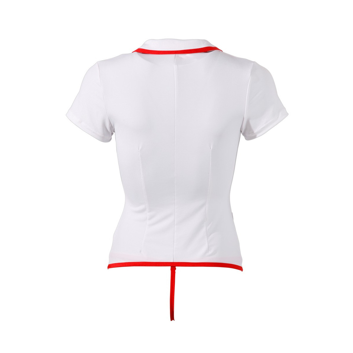 Camicia bianca con bretelle rosse, scollatura profonda, braccia corte, colletto e due bretelle.