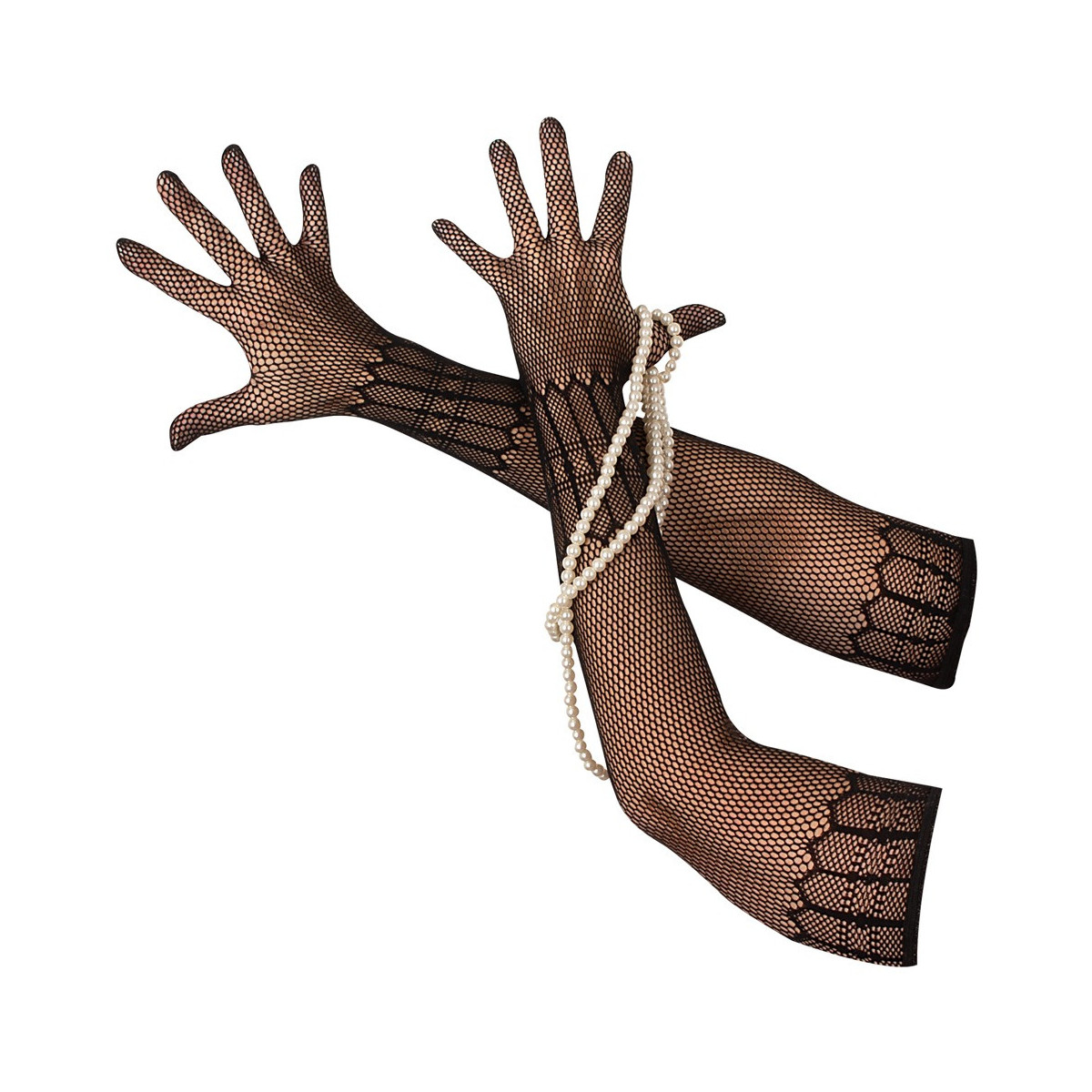 Guanti a rete lunghi fino al gomito per ogni occasione (erotica). Altamente elastico e con disegni grafici intrecciati su polsini e polsi.