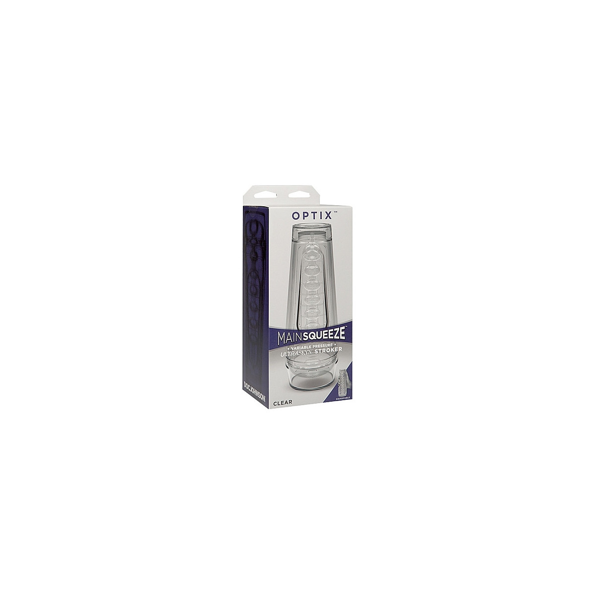 "Vedi te stesso in un modo completamente nuovo. L'innovativo modello Optix si unisce alla linea Main Squeeze di masturbatori con custodia rigida a pressione variabile di Doc Johnson e presenta un design unico completamente trasparente che non lascia nulla all'immaginazione. Ogni parte di Optix inclusa la custodia, le caratteristiche di piacere regolabili e il tunnel ULTRASKYN stretto e strutturato sono cristallini e offrono un'esperienza visivamente stimolante senza pari.