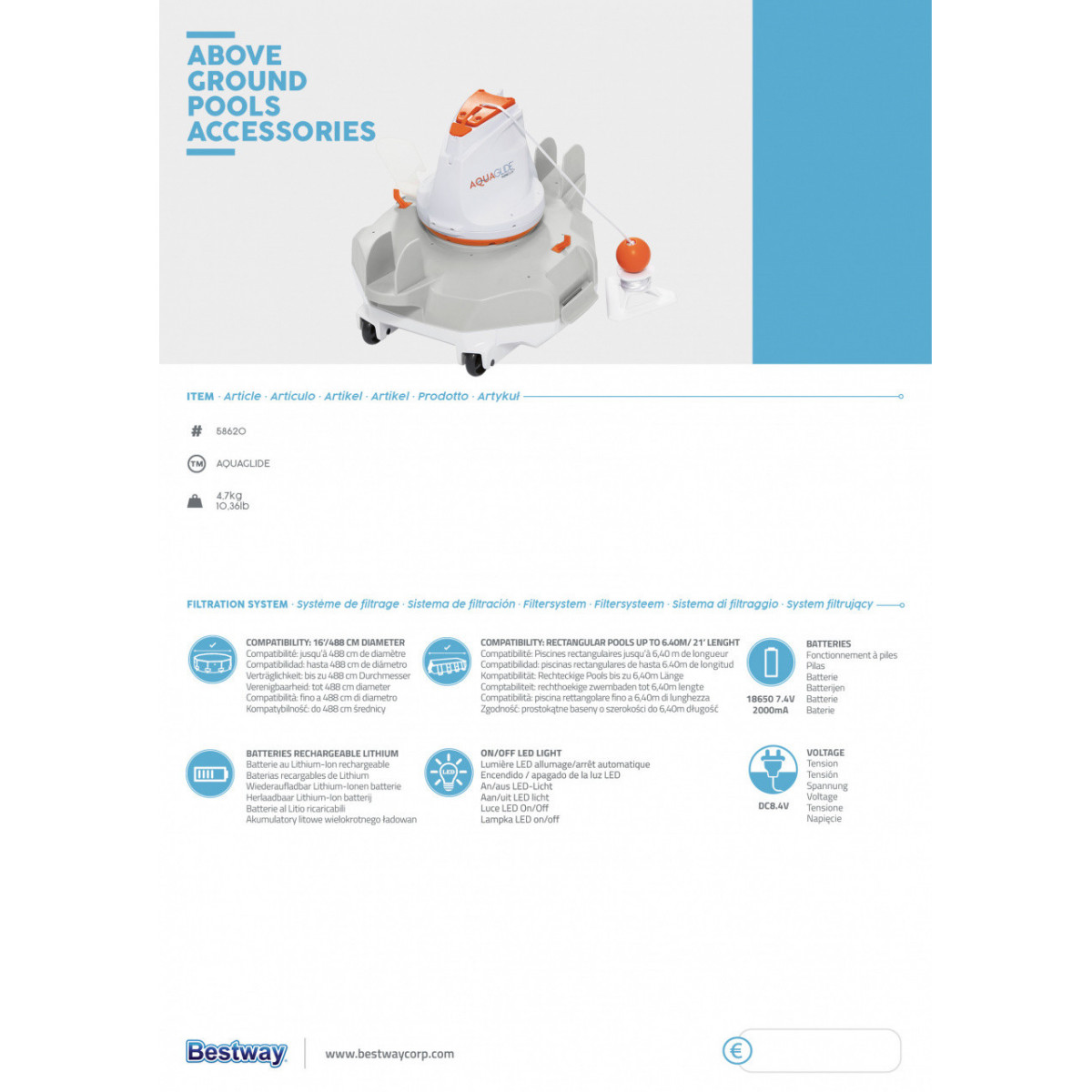 Bestway 58620. Tipo di prodotto: Aspiratore per piscina robotico, Adatto per: Piscina, Colore del prodotto: Grigio, Bianco. Alimentazione: Batteria, Tipo batteria: Batteria integrata, Tecnologia batteria: Ioni di Litio. Larghezza: 289 mm, Profondità: 367 mm, Altezza: 265 mm. Larghezza imballo: 420 mm, Profondità imballo: 320 mm, Altezza imballo: 320 mm. Quantità di cartone da spedizione: 1 pz, Lunghezza del cartone principale: 435 mm, Larghezza scatola principale: 335 mm