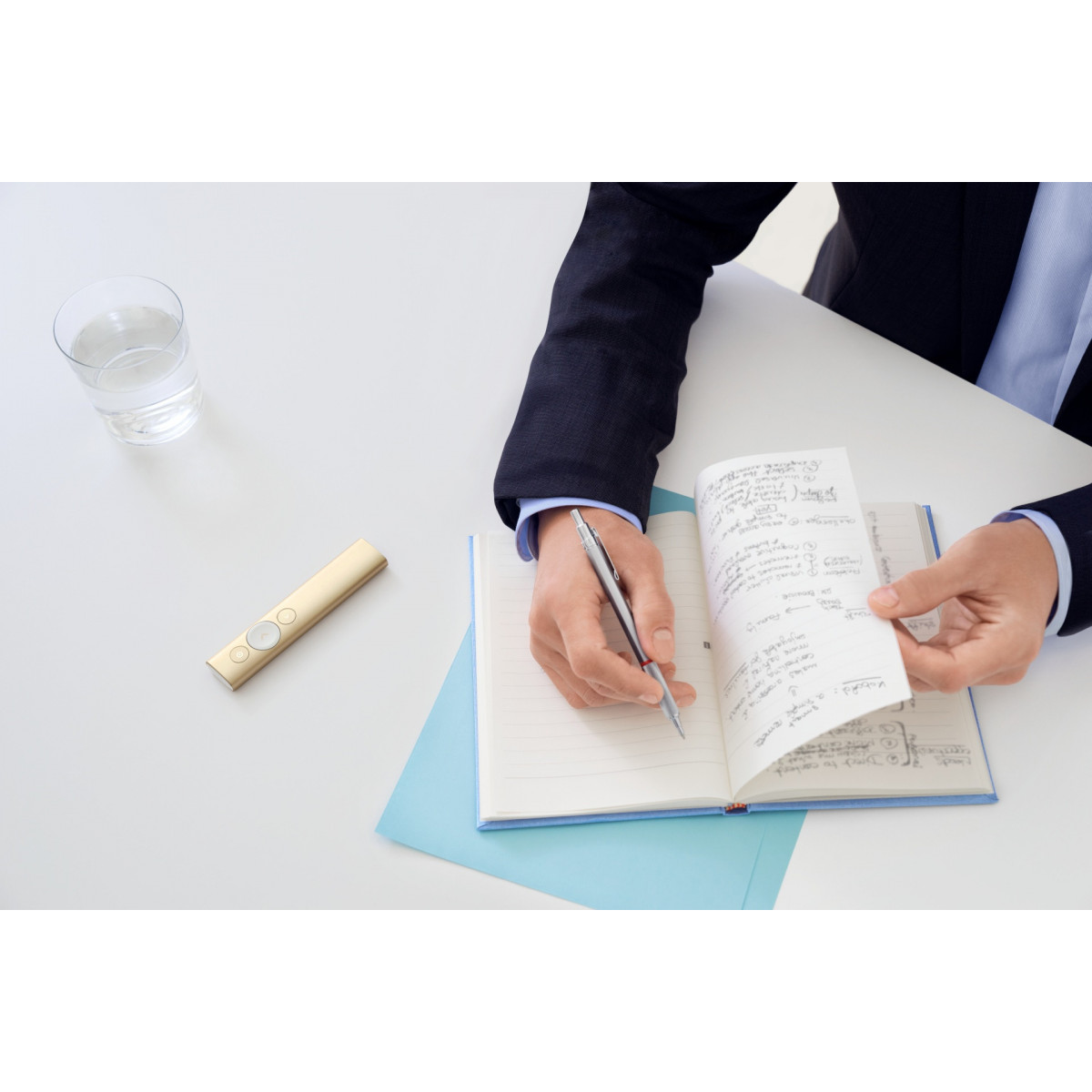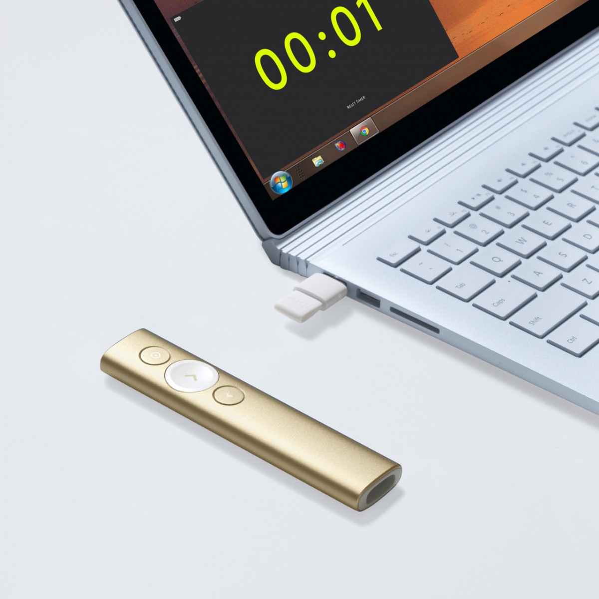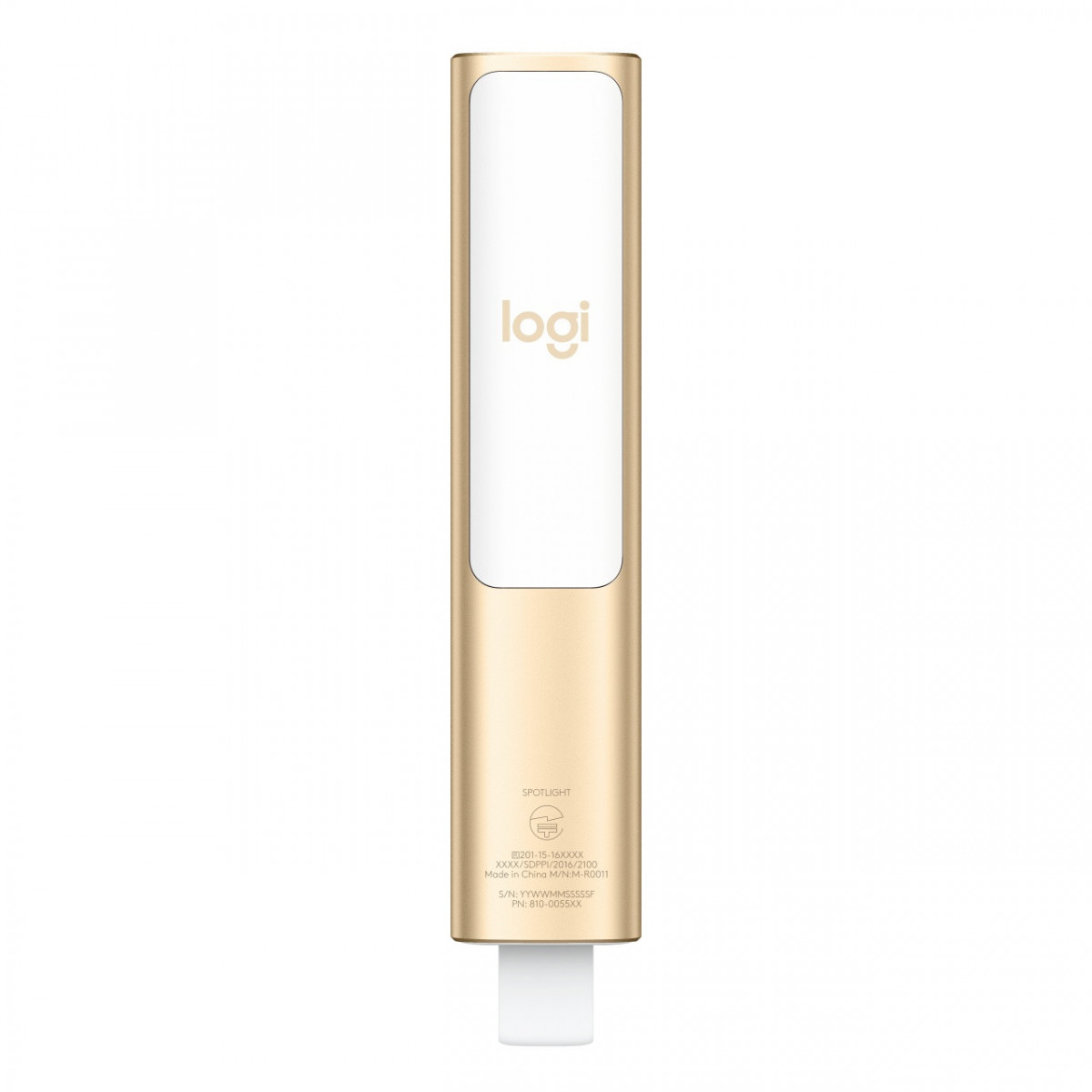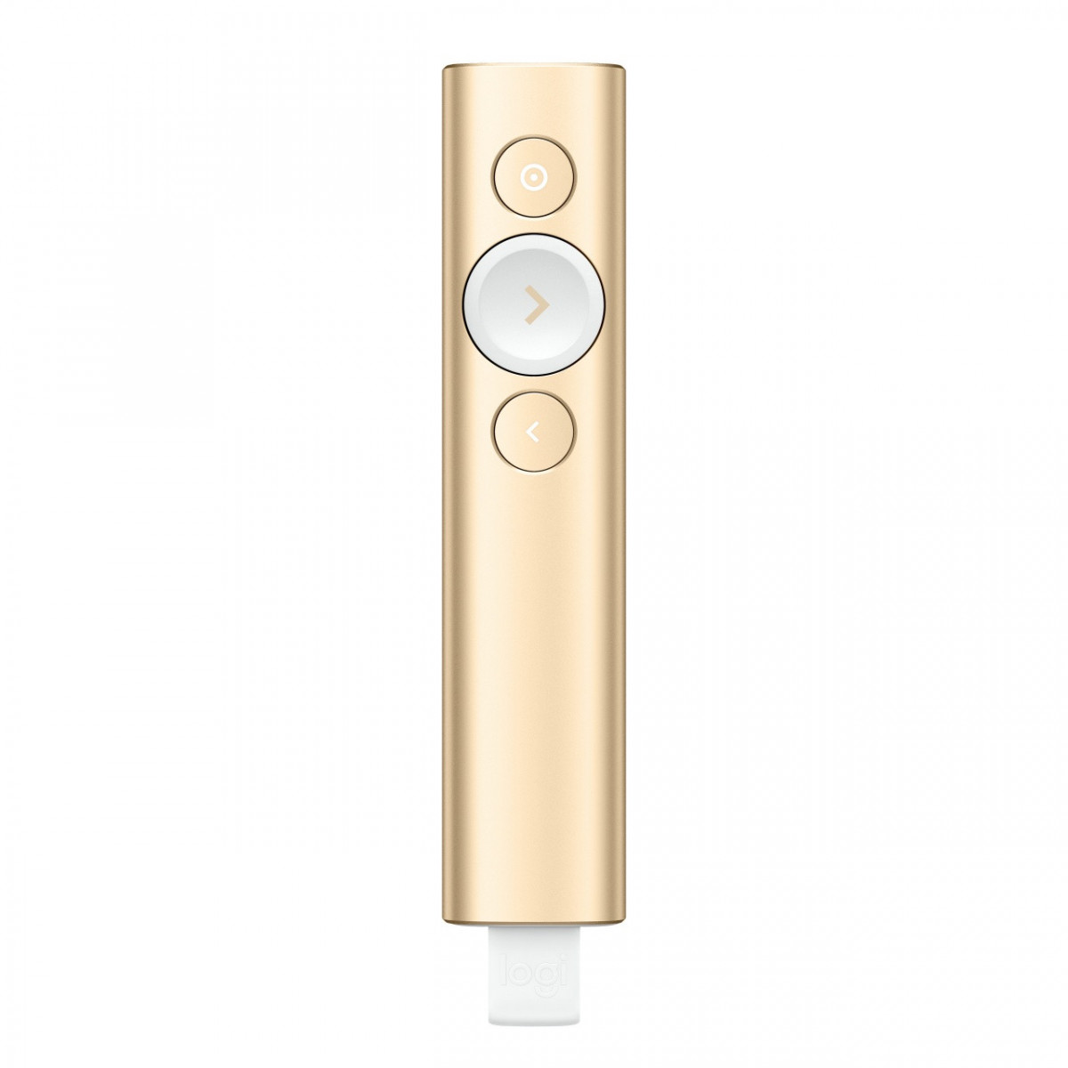 Logitech Spotlight. Tecnologia wireless: Bluetooth/RF, interfaccia ricevitore senza fili: USB, Banda di frequenza: 2.4 GHz. Tecnologia batteria: Polimeri di litio (LiPo). Colore del prodotto: Oro, funzioni di presentazione: Telecomando. Larghezza: 28,1 mm, Profondità: 12,1 mm, Altezza: 131,3 mm. Sistema operativo Windows supportato: Windows 10 Education,Windows 10 Education x64,Windows 10 Enterprise,Windows 10 Enterprise..., Compatibilità sistema operativo Mac: Mac OS X 10.10 Yosemite,Mac OS X 10.11 El Capitan,Mac OS X 10.12 Sierra