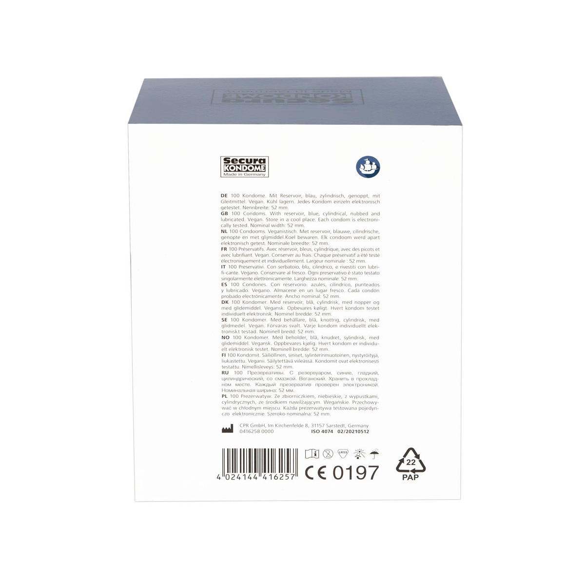 Preservativi blu Blue Pearl di Secura con eccitanti nodi di stimolazione. Con rivestimento umido a base di silicone e serbatoio. Vegano.