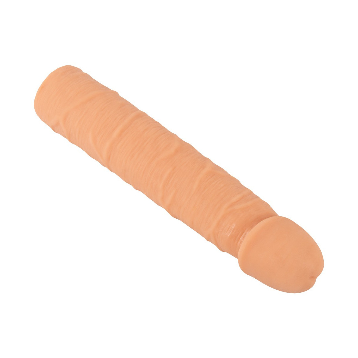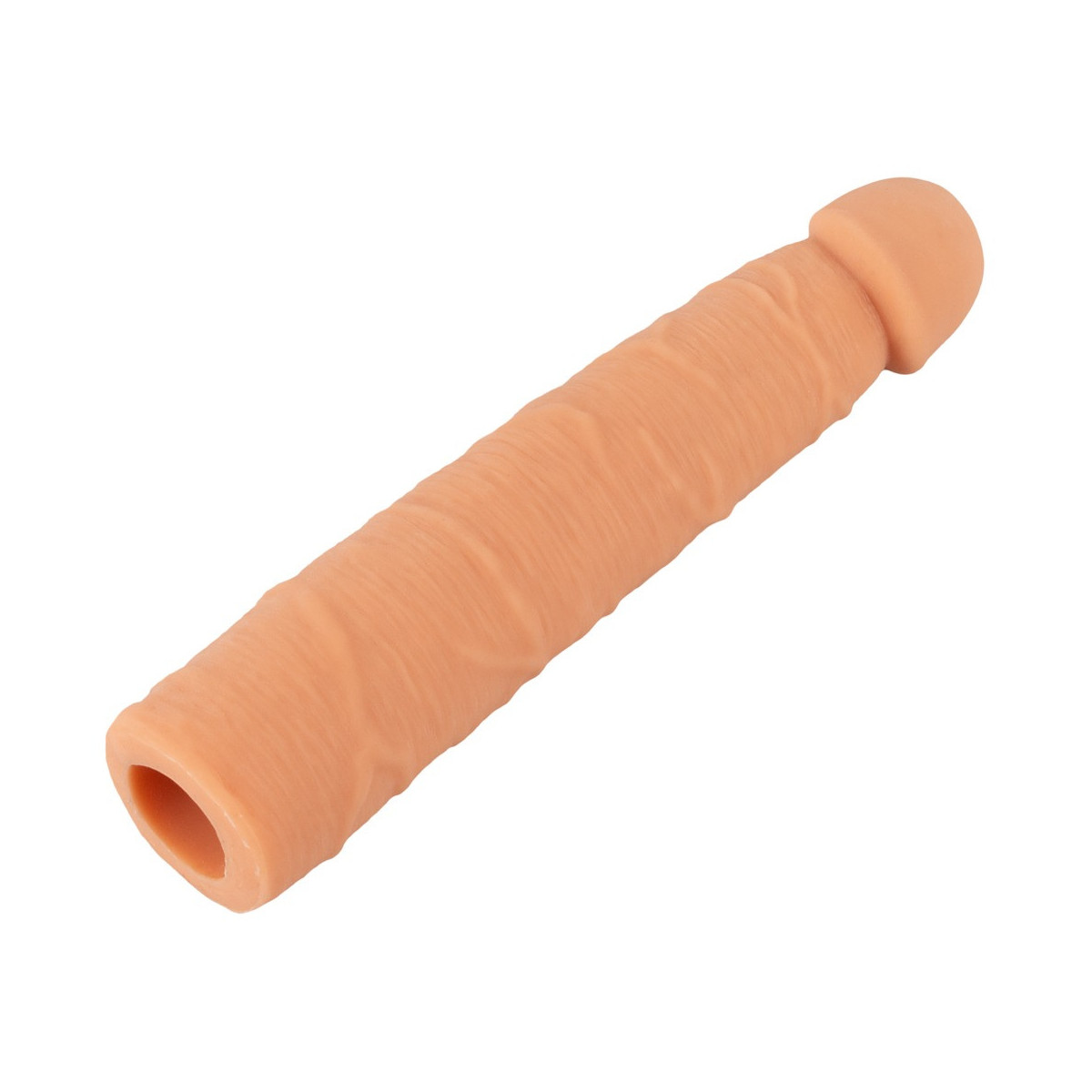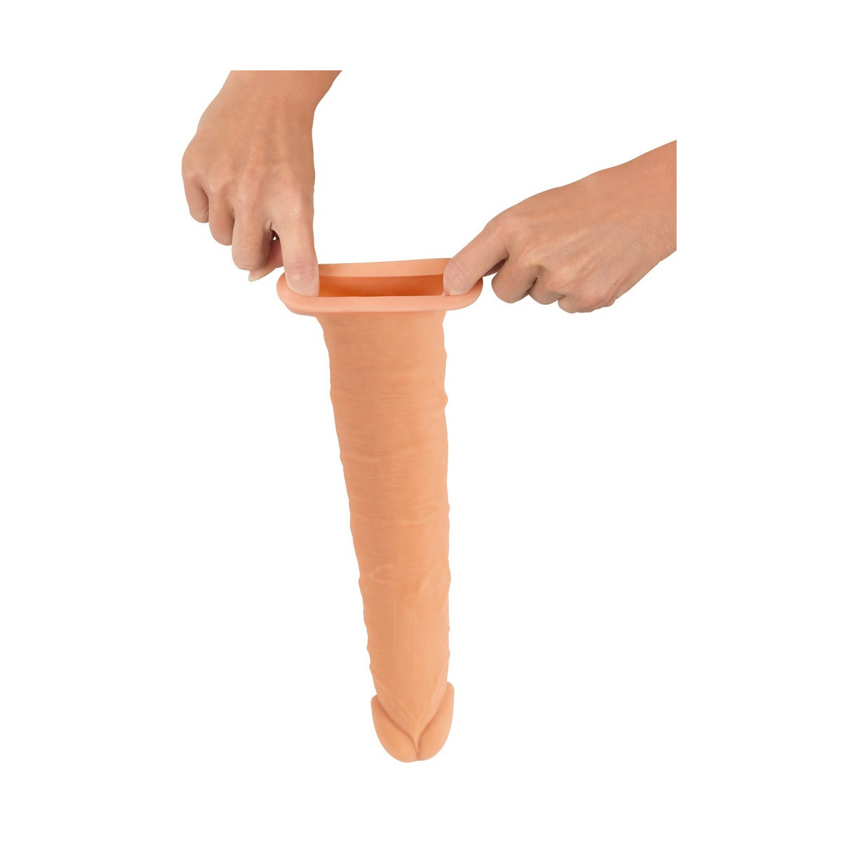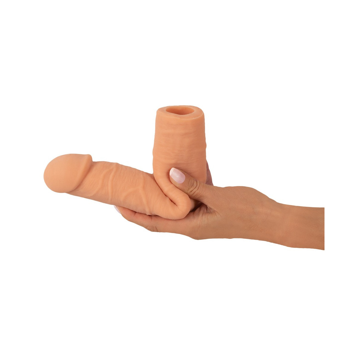 La guaina per pene Extension Sleeve di Nature Skin allunga il pene di 11,5 cm e lo ingrandisce di 2 cm di circonferenza. Per profondi e appaganti momenti di piacere a due, la guaina distintamente venata con il glande turgido viene semplicemente fatta scivolare sul membro.