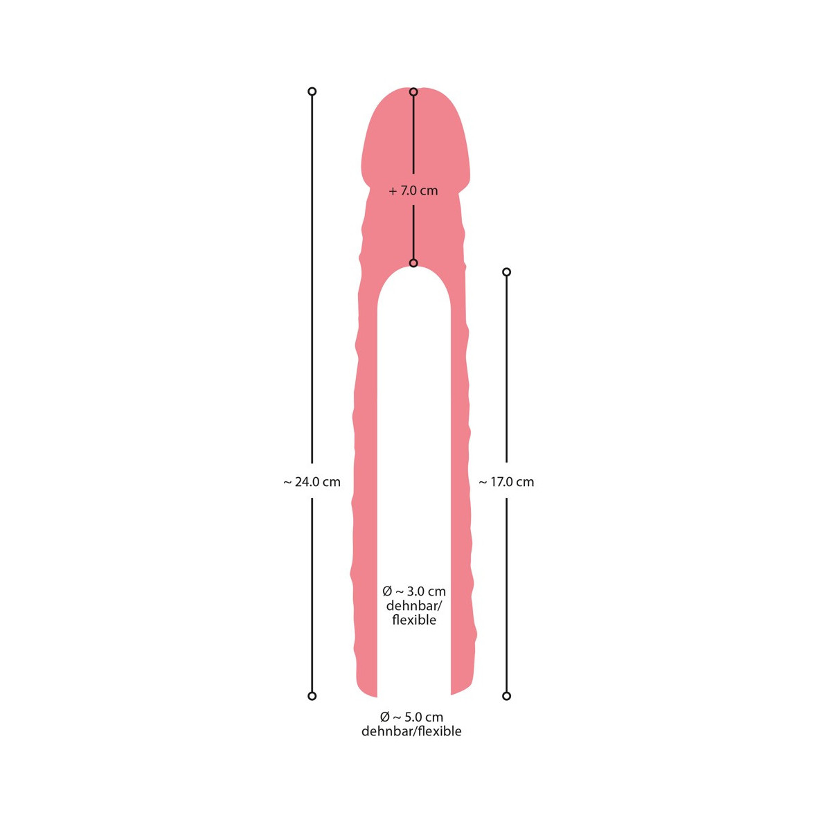 Lunghezza totale 25 cm, profondità di inserimento 13,5 cm, Ø interno 3 cm (molto elastico), Ø esterno massimo 5 cm. Peso 254 g.