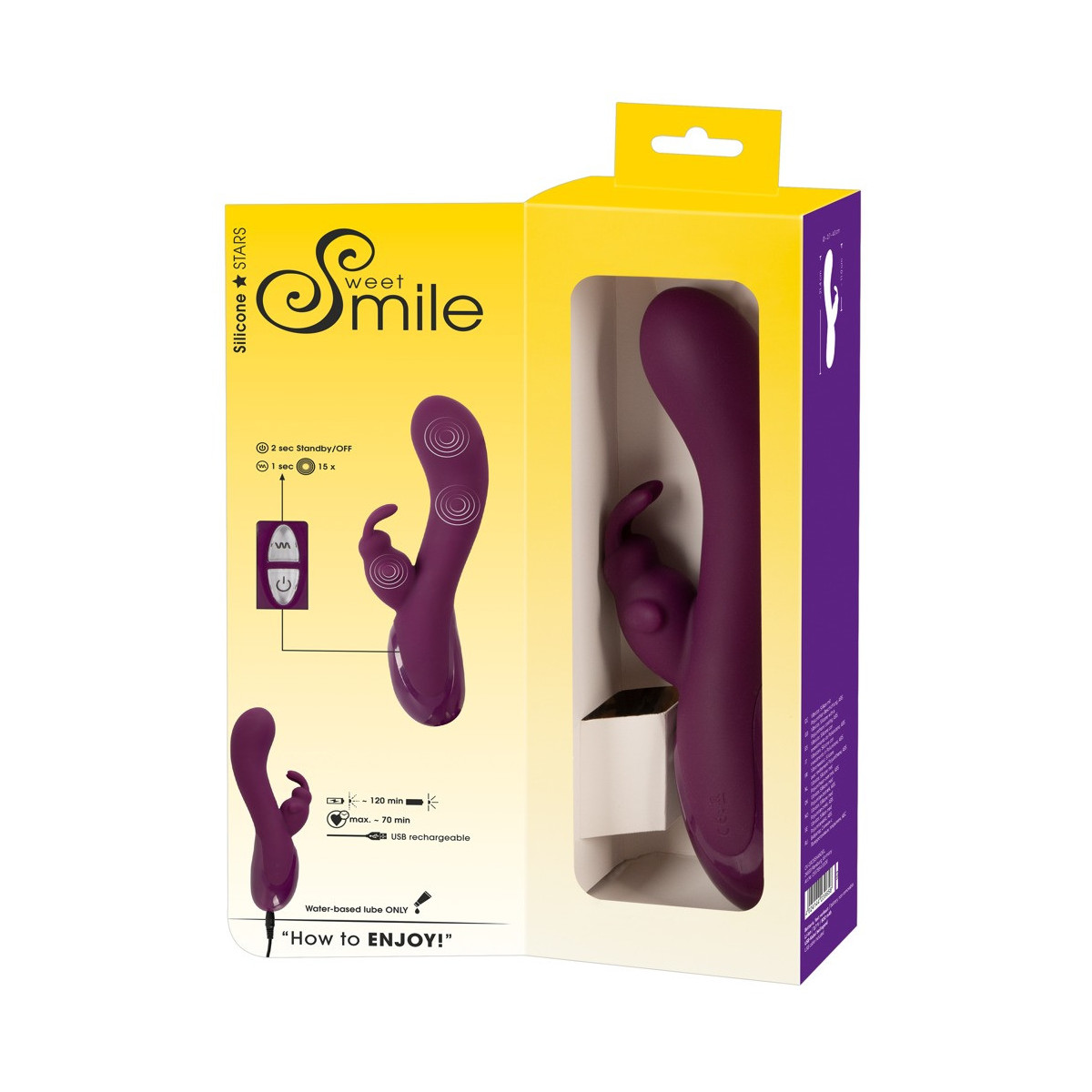 Il Rabbit Vibe di Sweet Smile, con il suo rivestimento in silicone vellutato, non solo colpisce per il suo aspetto e la sua sensazione, ma anche per le sue capacità. L'asta curva e flessibile e lo stimolatore clitorideo con orecchie mobili nascondono ben 15 modalità di vibrazione per coccolare contemporaneamente la vagina, la zona G e il clitoride.