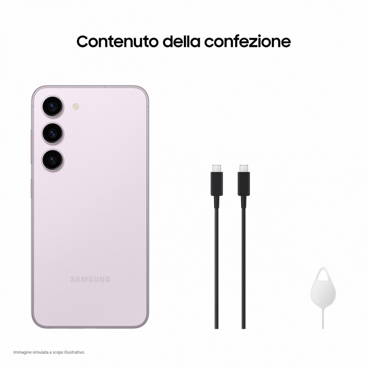 Samsung Galaxy S23 . Dimensioni schermo: 15,5 cm (6.1"), Risoluzione del display: 2340 x 1080 Pixel, Tipo di display: Dynamic AMOLED 2X. Famiglia processore: Qualcomm Snapdragon, Modello del processore: 8 Gen 2. Capacità della RAM: 8 GB, Capacità memoria interna: 128 GB. Risoluzione fotocamera posteriore (numerico): 50 MP, Tipo di fotocamera posteriore: Tripla fotocamera. Capacità della scheda SIM: Tripla SIM. Sistema operativo incluso: Android 13. Capacità della batteria: 3900 mAh. Colore del prodotto: Lavanda. Peso: 168 g