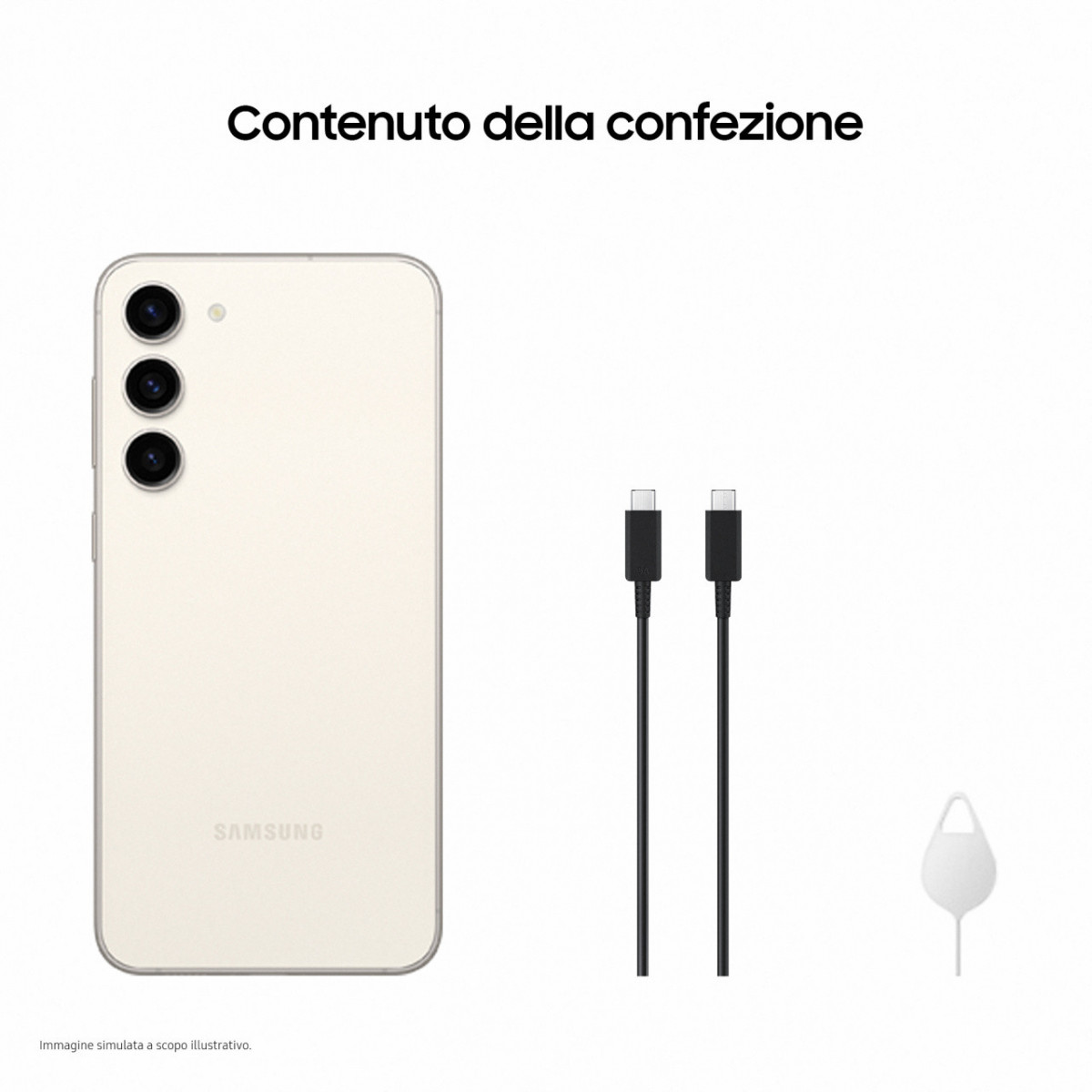 Samsung Galaxy S23+ . Dimensioni schermo: 16,8 cm (6.6"), Risoluzione del display: 2340 x 1080 Pixel, Tipo di display: Dynamic AMOLED 2X. Famiglia processore: Qualcomm Snapdragon, Modello del processore: 8 Gen 2. Capacità della RAM: 8 GB, Capacità memoria interna: 256 GB. Risoluzione fotocamera posteriore (numerico): 50 MP, Tipo di fotocamera posteriore: Tripla fotocamera. Capacità della scheda SIM: Tripla SIM. Sistema operativo incluso: Android 13. Capacità della batteria: 4700 mAh. Colore del prodotto: Crema. Peso: 195 g