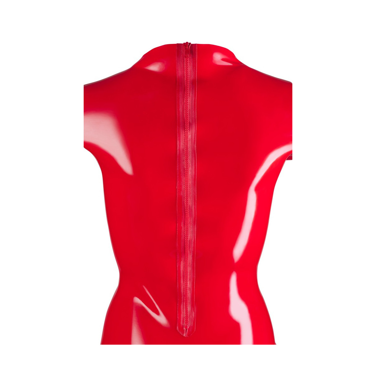 L'abito rosso con maniche lunghe ha una cerniera che può essere indossata sia davanti che dietro. Immerso su forma piatta.