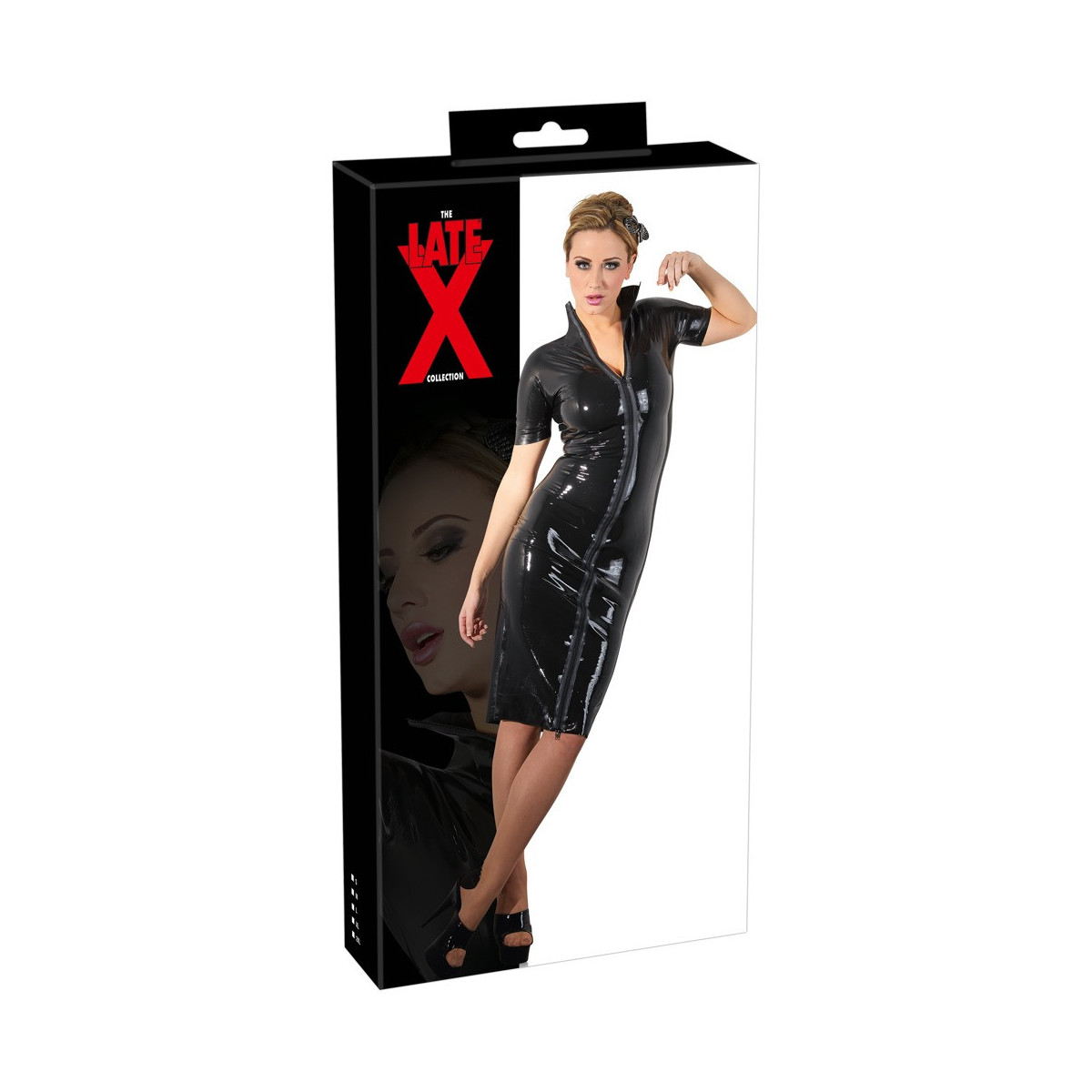 Questo abito in lattice di raffinata lunghezza midi con maniche a metà lunghezza ha un taglio sottile e punteggiato da un piccolo colletto rialzato e da una zip continua a 2 vie sul davanti. Semplicemente fresco e seducente!