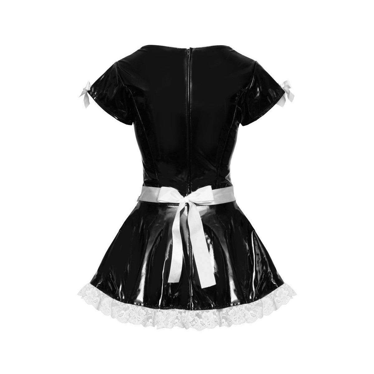 Sexy abito da servizio con maniche corte di Black Level completamente in vernice nera lucida con grembiule allegato in vernice bianca. La scollatura bassa e l'orlo oscillante della gonna svasata sono decorati con pizzo bianco, così come il piccolo grembiule. I fiocchi decorativi aggiungono un tocco giocoso. Zip sul retro per una facile vestizione e svestizione.
