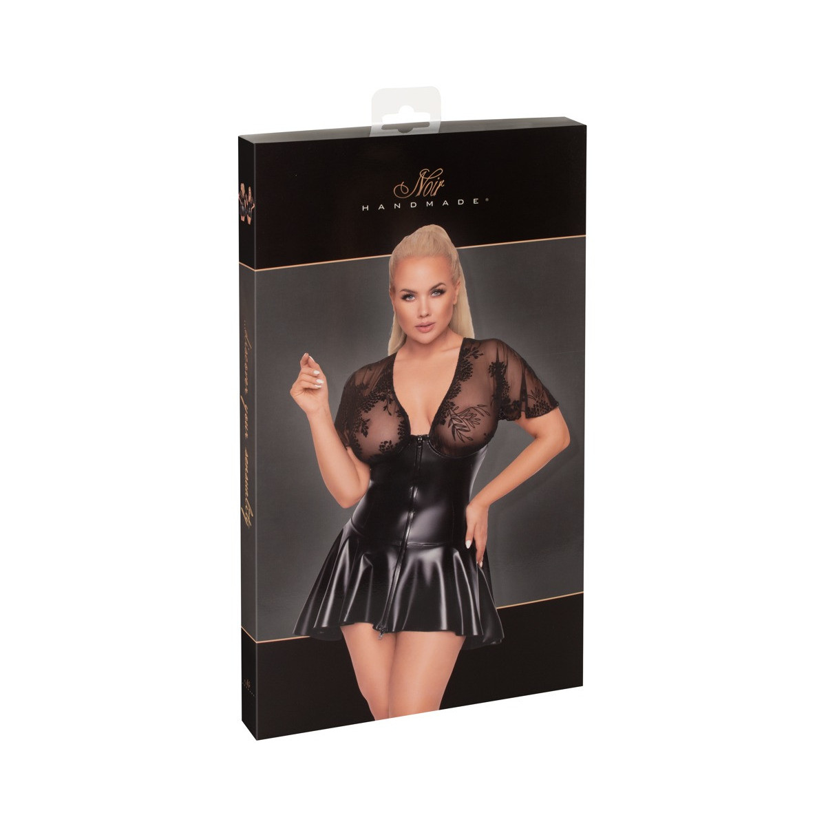 Abito corto di Noir Handmade Curves in stile corsage con gonna leggermente svasata. In powerwetlook nero nobile con top scollato e maniche corte e larghe in tulle di velluto con stampa flock. Fronte con zip a tutta lunghezza. Elastico dappertutto per il massimo comfort.
