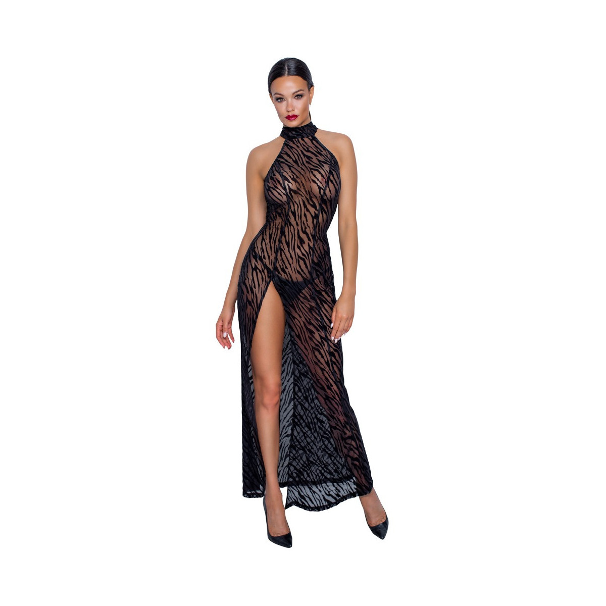 Esclusivo abito alla caviglia di Noir completamente realizzato in powernet elastico e morbido con stampa flock di velluto fine in look tigrato. Si adatta alla pelle ed è molto comodo da indossare. Davanti al lato con spacco extra alto da passeggio. Nel collo il colletto stand-up è chiuso con 3 bottoni, nella parte posteriore una profonda scollatura ovale seduce.