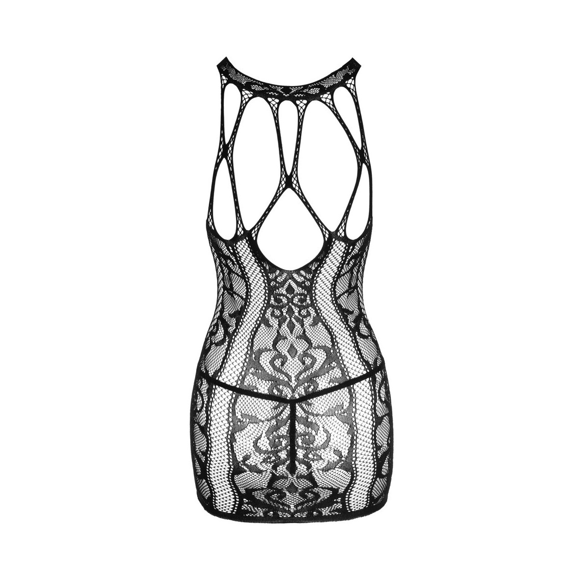 Vestiti in vari look a rete con ornamenti intrecciati di NO:XQSE, compreso il perizoma di pizzo. Tutto fatto senza cuciture e meravigliosamente morbido ed elastico per un alto comfort di vestibilità. Ritagli sul décolleté decorati con fasce elastiche. Look stravagante sul retro fatto di fasce elastiche e rete.