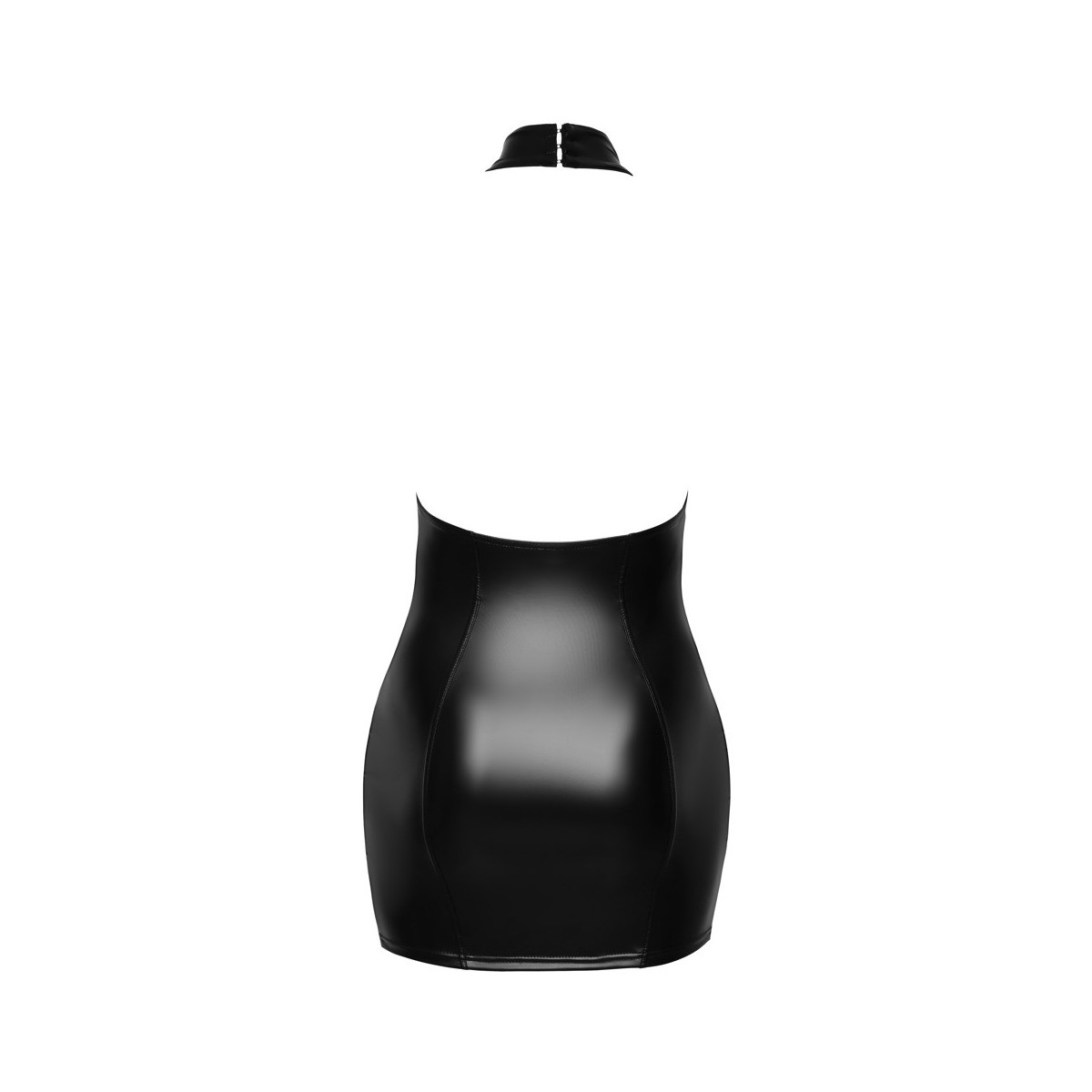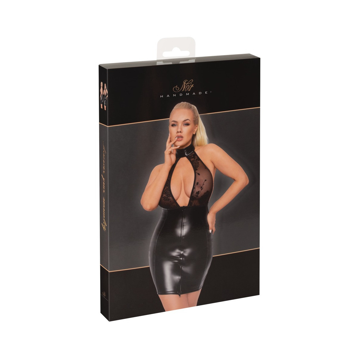Abito corto aderente di Noir Handmade Curves in powerwetlook nero nobile con tulle di velluto stampato a fiocco come top scollato. Fronte con zip a tutta lunghezza dall'ombelico all'orlo. Senza schienale - il collo halter si chiude con dei bottoni. Elastico tutto intorno per una vestibilità aderente e il massimo comfort.