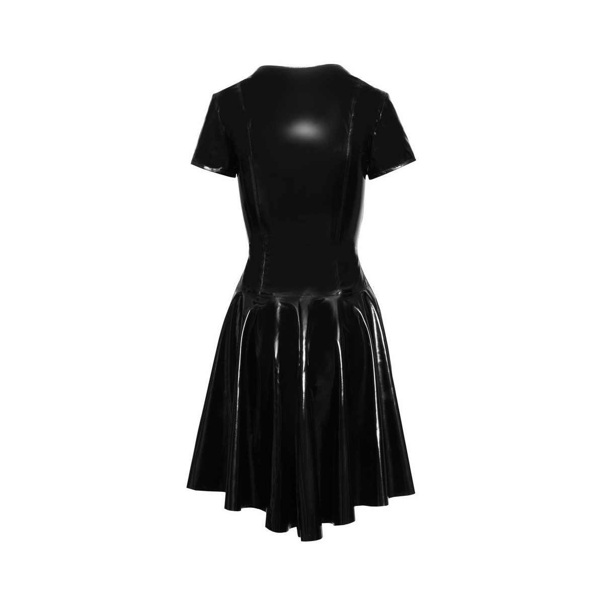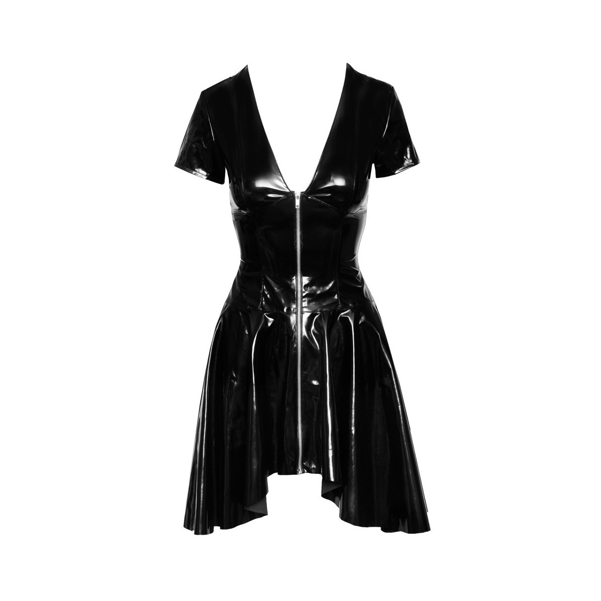 Abito a mezze maniche di Black Level completamente in vernice nera lucida con zip metallica a tutta lunghezza sul davanti. Taglio aderente alla figura con una profonda scollatura a V. La gonna oscillante leggermente svasata è più corta davanti e più lunga dietro.