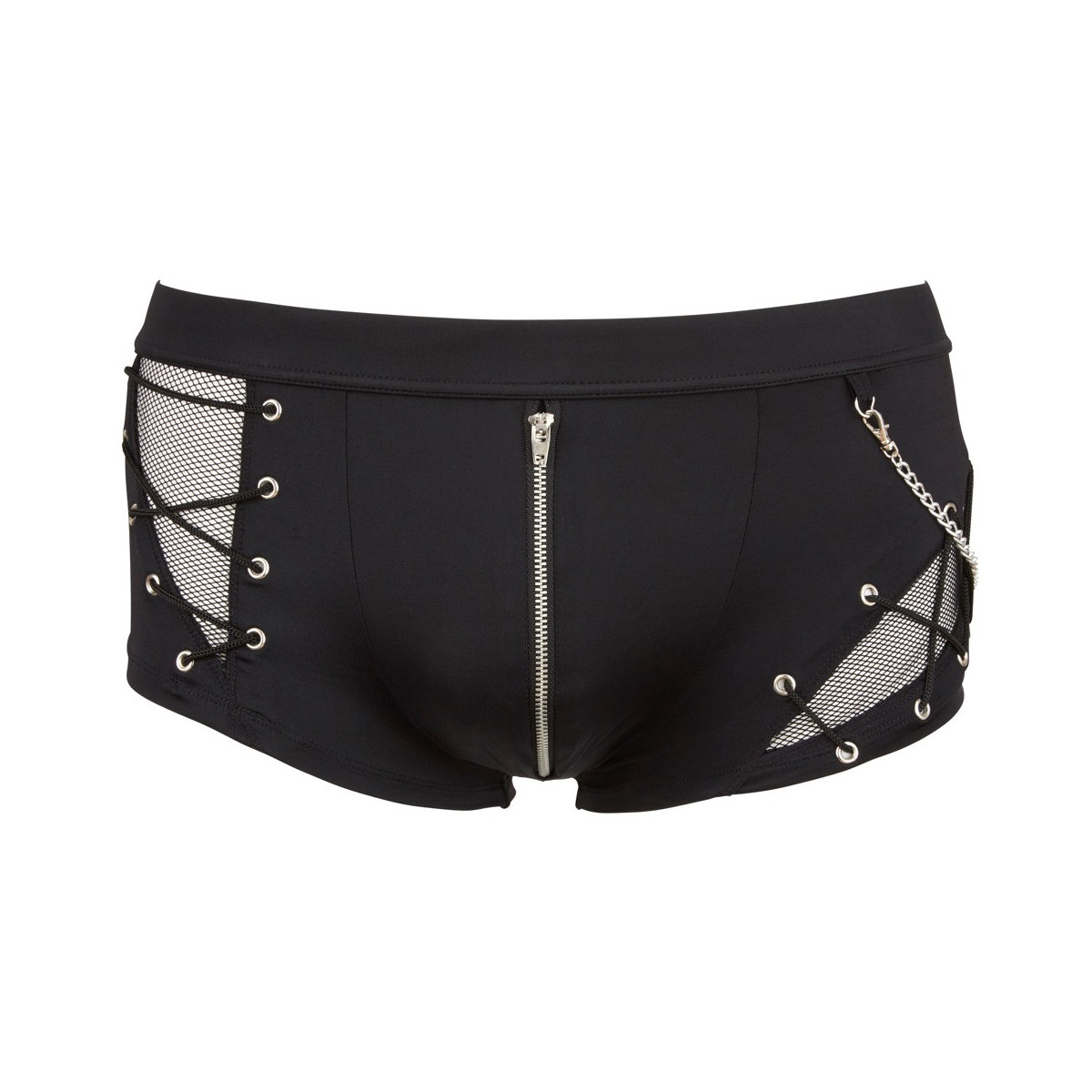 Pantaloni in un sapiente mix di materiali opachi e trasparenti (a rete) con catena decorativa rimovibile e cerniera sul davanti. Nero. Altamente elastico.