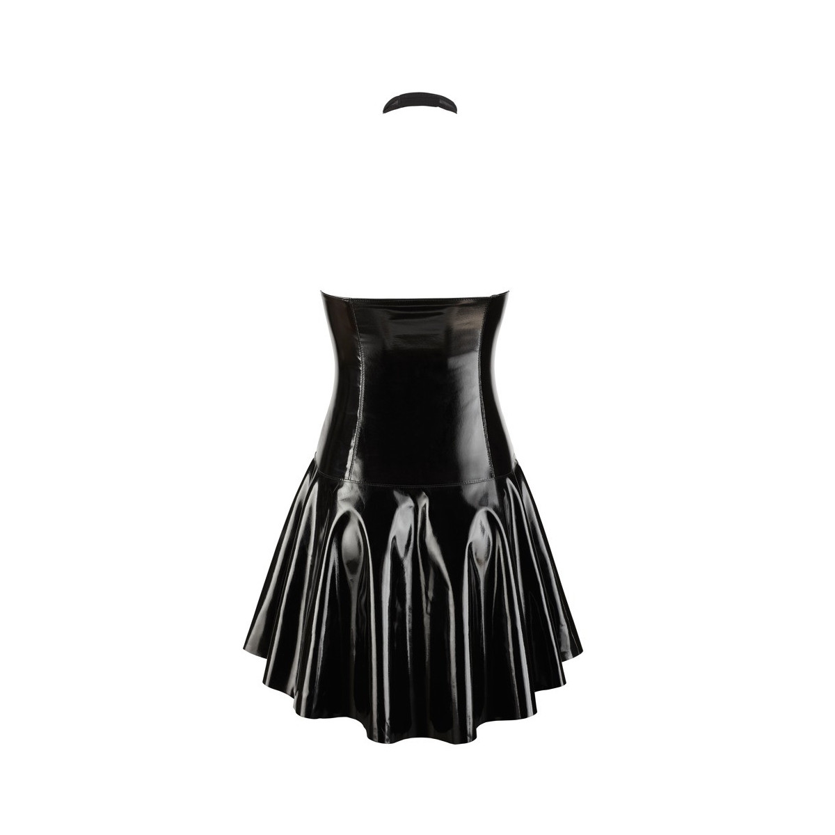 Abito corto di Black Level completamente in vernice nera lucida con coppe e collo halter in powernet. Tagliato vicino alla figura con una gonna svasata che è un po' più lunga dietro che davanti. Una zip a tutta lunghezza corre dalla scollatura a tuffo fino all'orlo sul davanti.