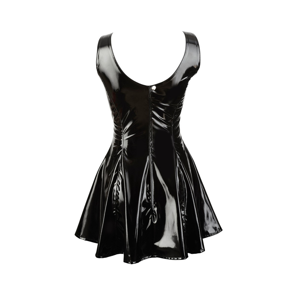 Abito corto e senza maniche di Black Level completamente in vernice nera lucida con profonda scollatura davanti e dietro. Tagliato vicino alla figura con una gonna svasata. Con zip integrata sul retro.