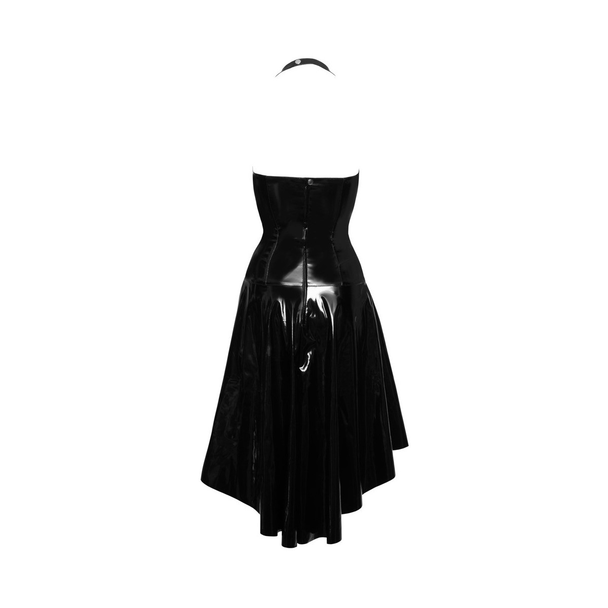 Abito di Black Level completamente in vernice nera lucida con collo a metà. In un taglio aderente alla figura con allacciatura sexy nella profonda scollatura a V, che copre appena i capezzoli. La gonna svasata oscillante è più corta davanti e più lunga dietro. Zip sul retro, collo alto con chiusura a bottoni a pressione.
