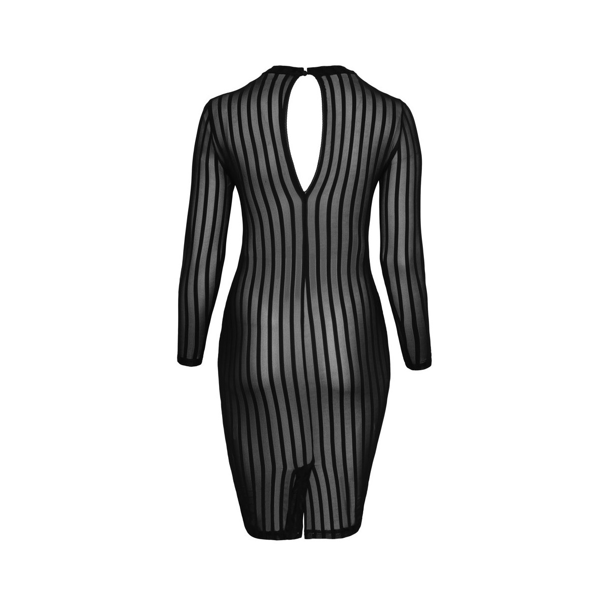 Abito a maniche lunghe di Noir Handmade Curves realizzato interamente in fine tulle elastico in un nobile disegno a strisce - elastico dappertutto e una perfetta vestibilità per il massimo comfort. In un'elegante lunghezza al ginocchio con un piccolo spacco sul retro. Il colletto stand-up si chiude con un piccolo bottone al collo sopra la scollatura ovale posteriore.