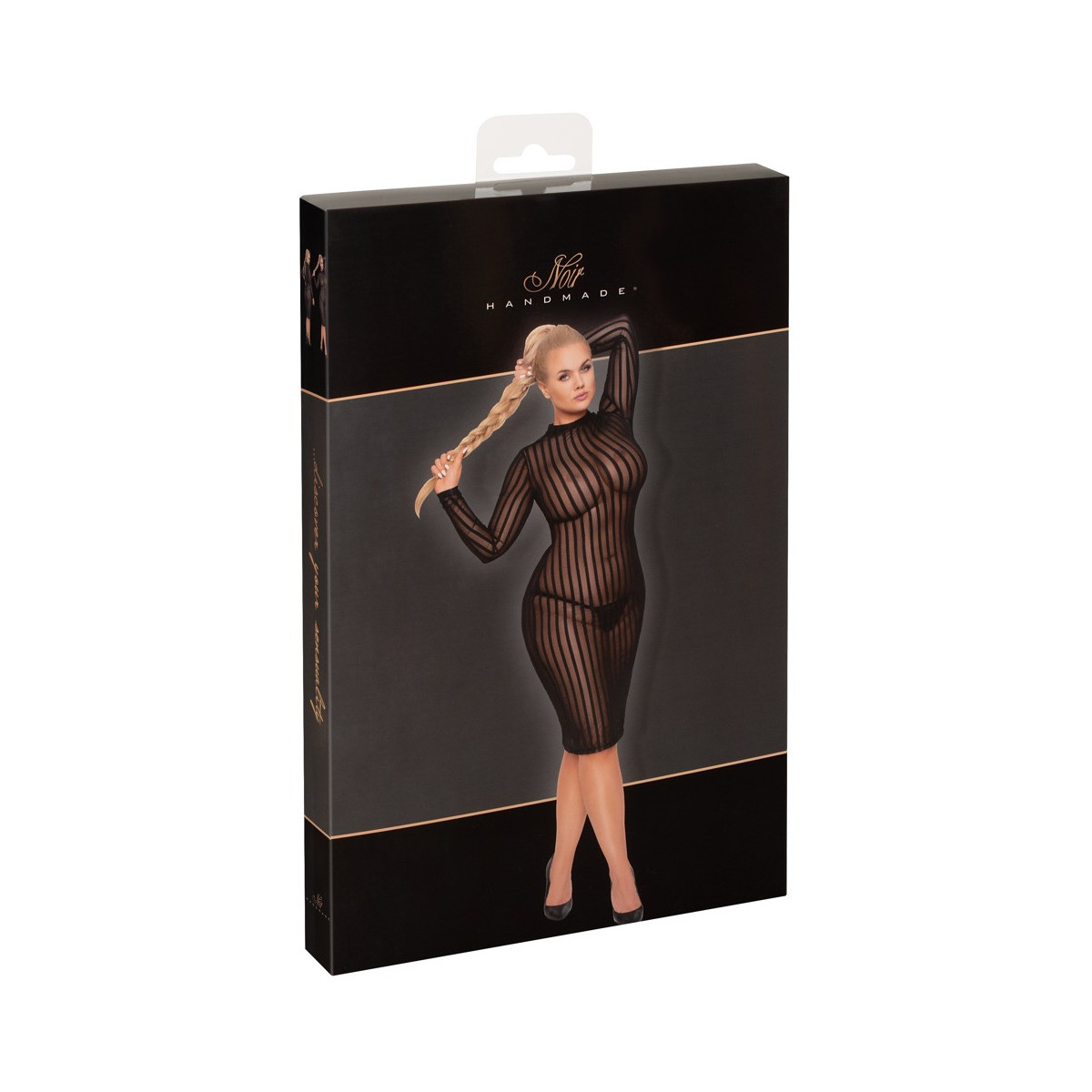 Abito a maniche lunghe di Noir Handmade Curves realizzato interamente in fine tulle elastico in un nobile disegno a strisce - elastico dappertutto e una perfetta vestibilità per il massimo comfort. In un'elegante lunghezza al ginocchio con un piccolo spacco sul retro. Il colletto stand-up si chiude con un piccolo bottone al collo sopra la scollatura ovale posteriore.