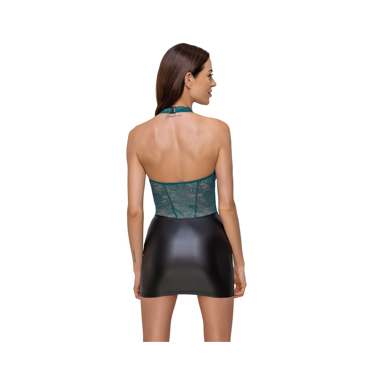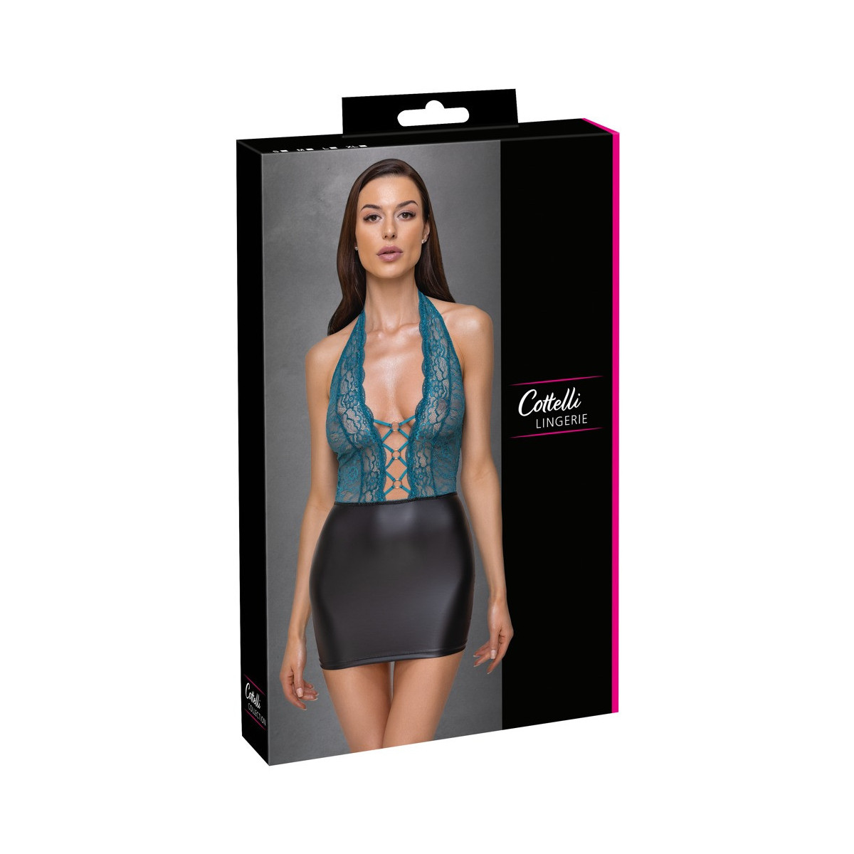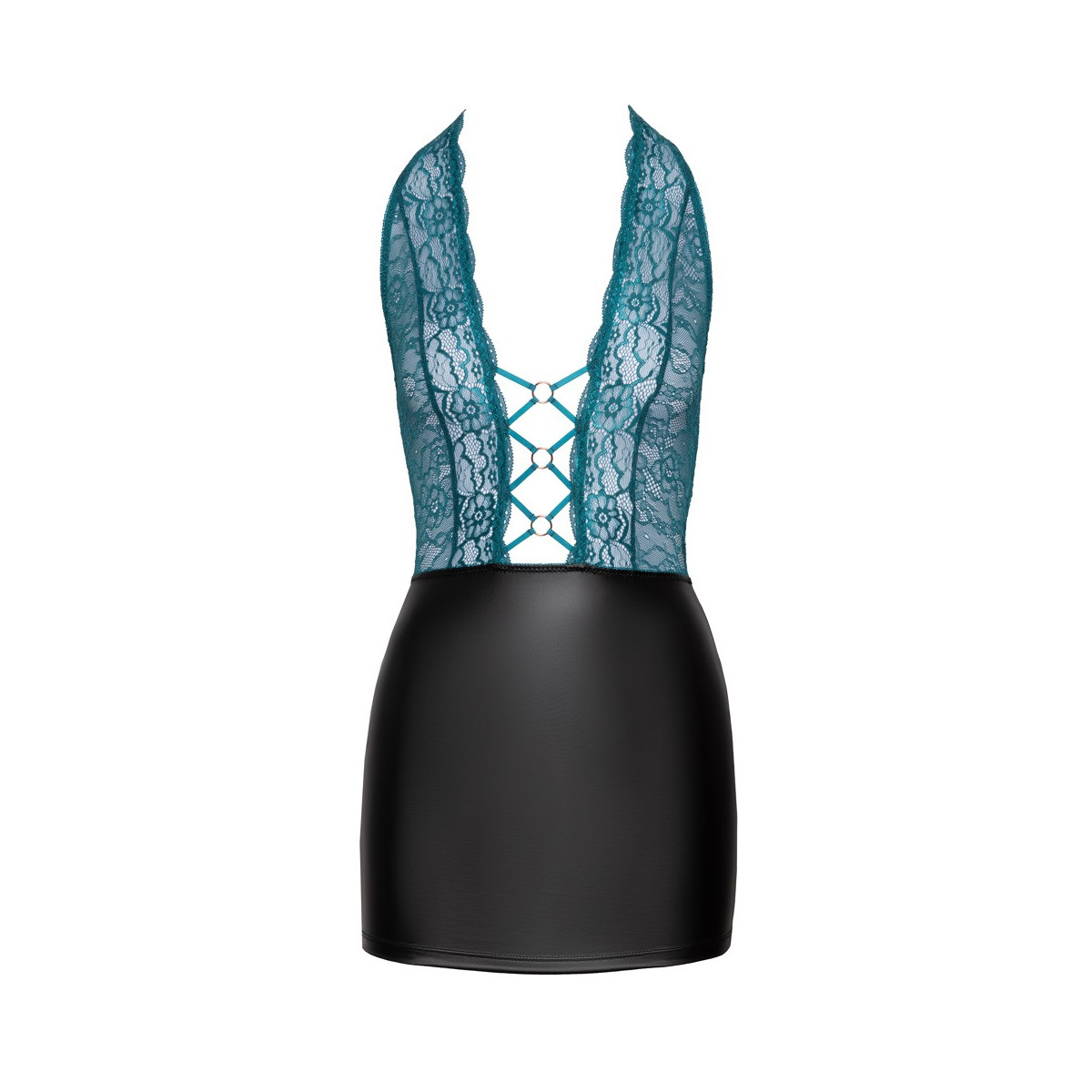 Abito corto aderente di Cottelli LINGERIE in due pezzi con parte superiore in fine pizzo color petrolio e parte della gonna in nobile look nero opaco. Profondamente scollato fino all'ombelico - 3 anelli color oro rosa e fasce elastiche tengono tutto insieme piacevolmente. Senza schienale, il collo alto ha una chiusura a clip.