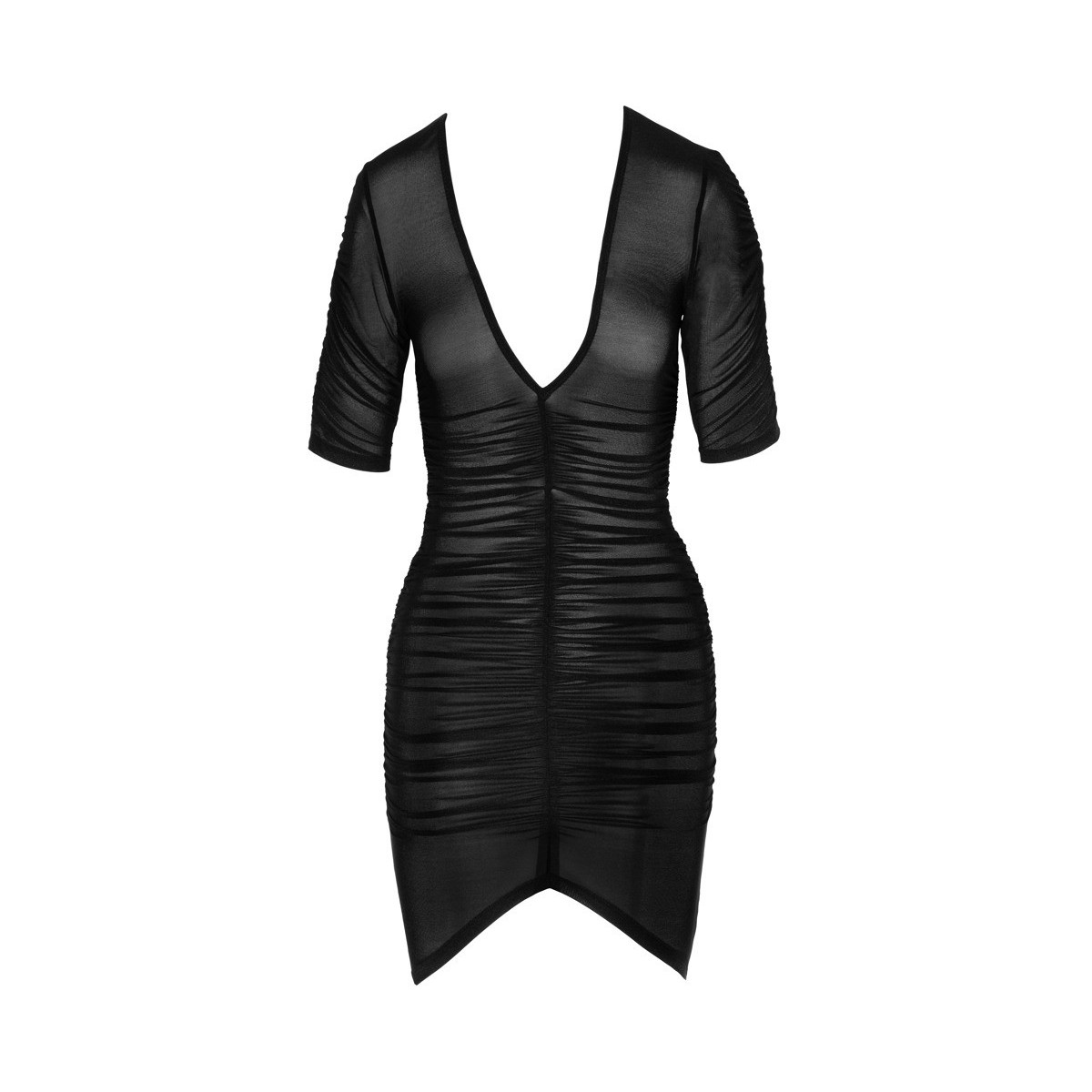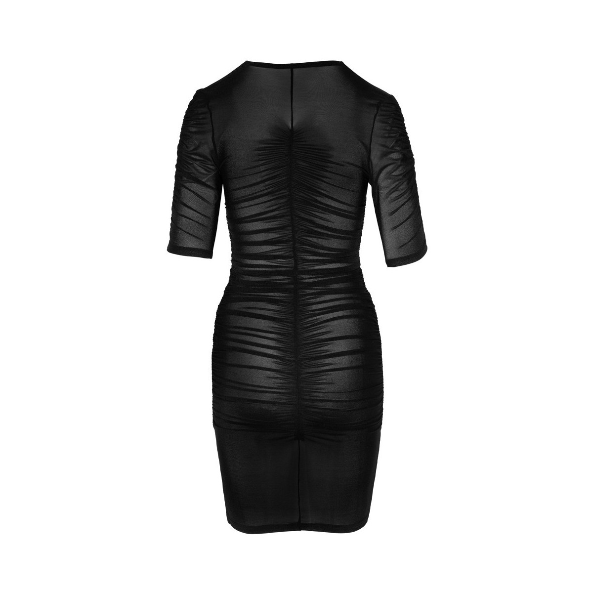 Miniabito a mezze maniche in nero semitrasparente con efficace arricciatura davanti e dietro. Questo rende l'orlo un po' più corto davanti che sui lati e dietro. Taglio extra basso a V sul davanti. Morbido e altamente elastico per un elevato comfort di vestibilità.