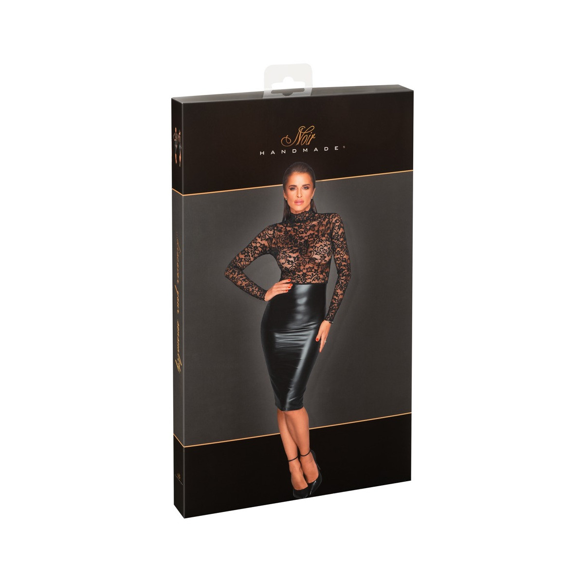 Abito a maniche lunghe al ginocchio di Noir dal taglio aderente in un nobile mix nero di morbido pizzo (top) e power wetlook opaco e lucido (gonna). Piccolo colletto rialzato sul retro con 2 bottoni. Piccolo spacco nell'orlo posteriore.