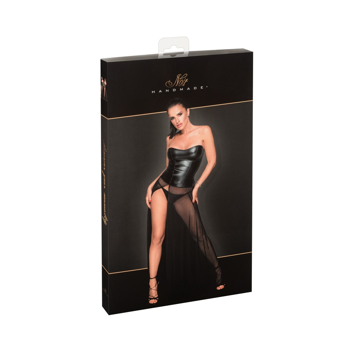 Abito alla caviglia in un mix di powerwetlook opaco e lucido (corpetto) e powernet trasparente (gonna). Il corpetto dal taglio stretto è ornato da pietre scintillanti sul davanti, che continuano nell'alto spacco laterale della gonna. Nella parte posteriore la gonna è anche mozzafiato con uno spacco alto nel mezzo.