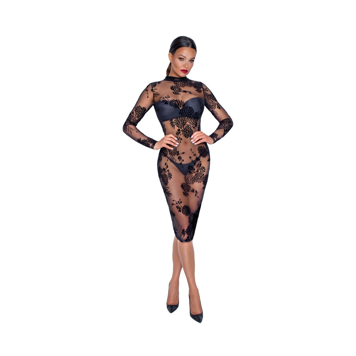 Abito a maniche lunghe di Noir completamente realizzato in powernet elastico con stampa flock di velluto fine in disegno floreale. Lunghezza al ginocchio con uno spacco di 18 cm sul retro. Il colletto stand-up è chiuso nel collo sopra la scollatura ovale posteriore con un piccolo bottone.