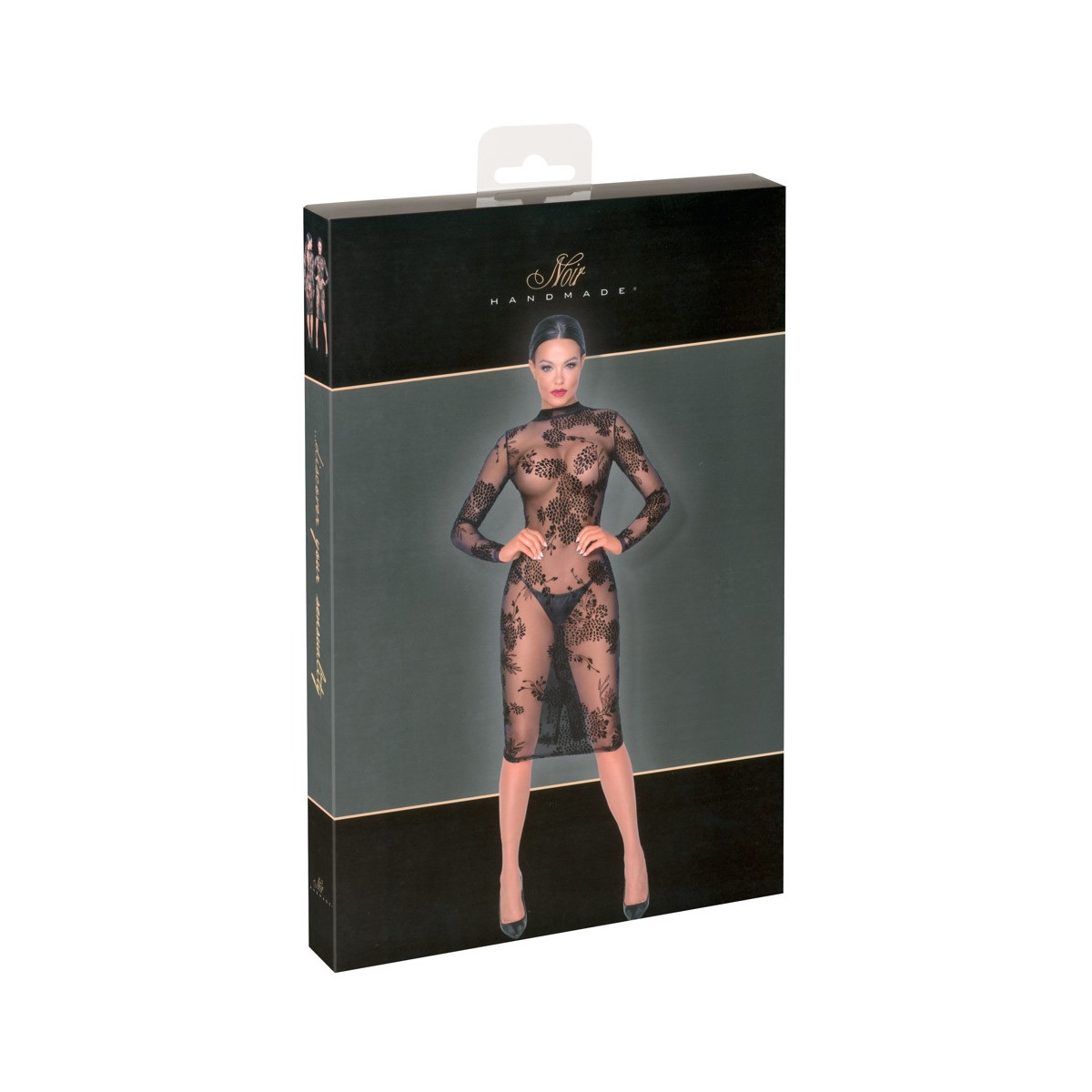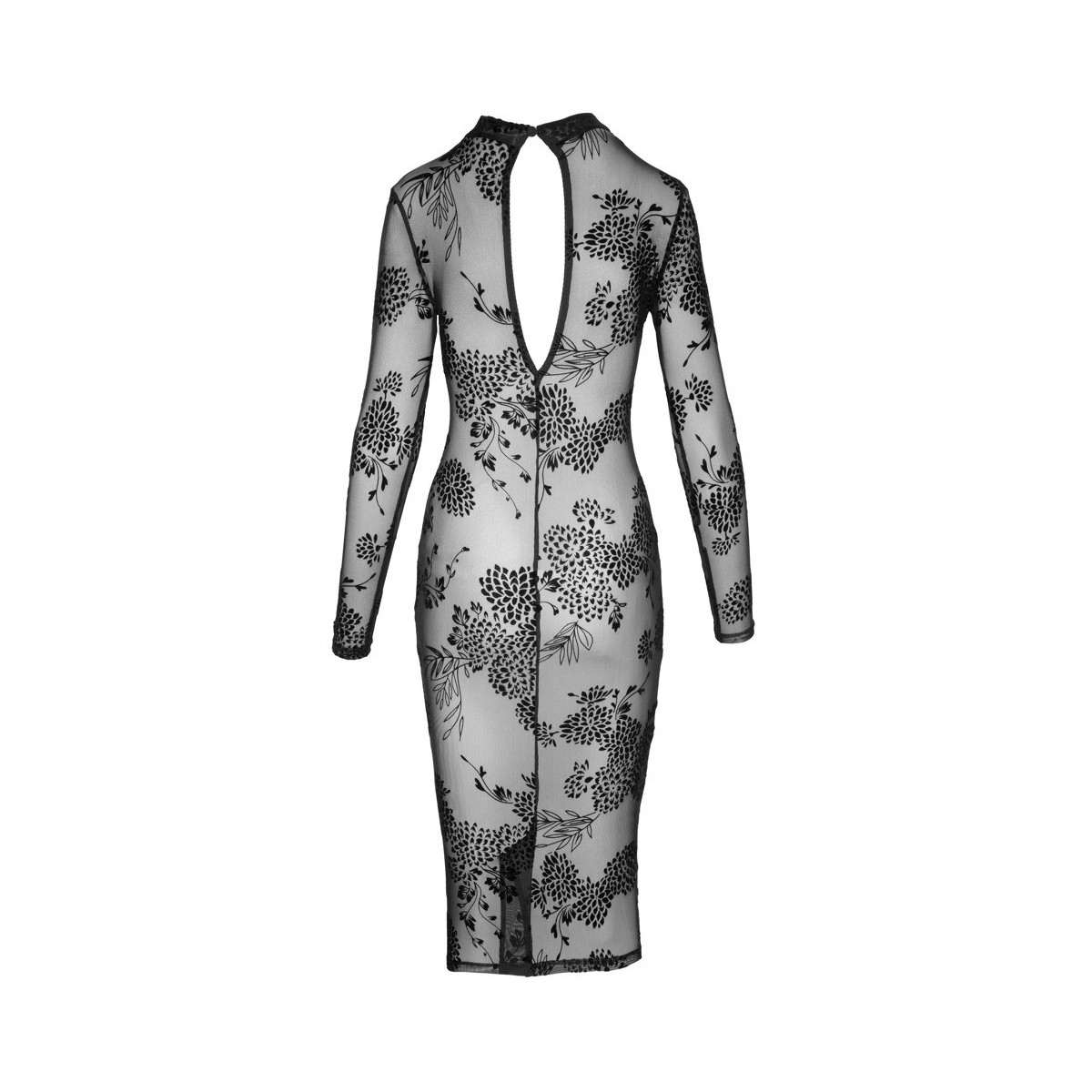 Abito a maniche lunghe di Noir completamente realizzato in powernet elastico con stampa flock di velluto fine in disegno floreale. Lunghezza al ginocchio con uno spacco di 18 cm sul retro. Il colletto stand-up è chiuso nel collo sopra la scollatura ovale posteriore con un piccolo bottone.