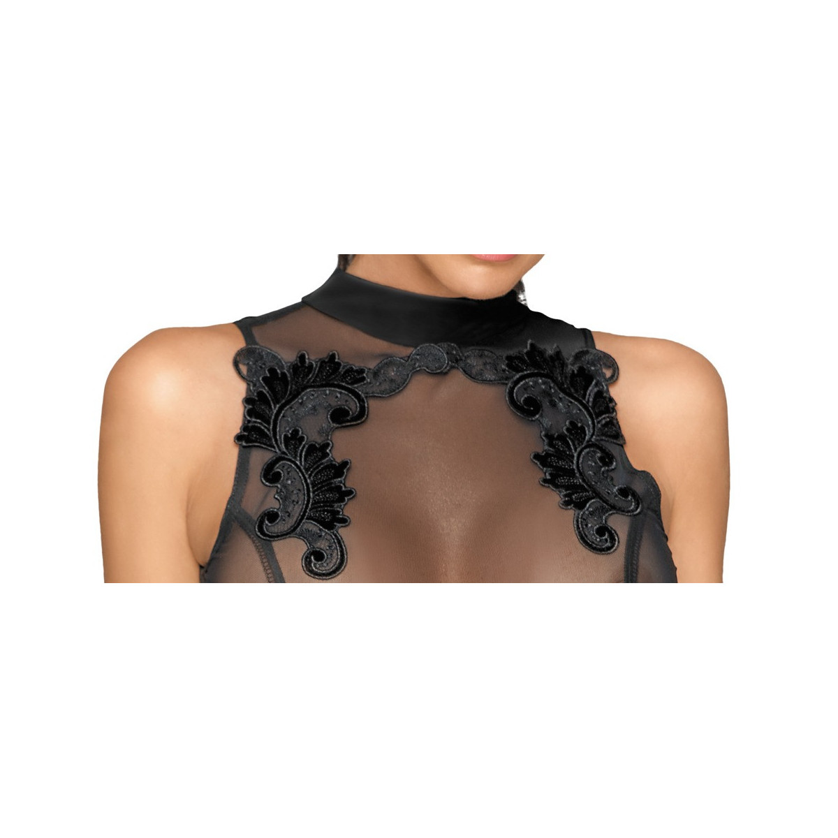 Abito elastico senza maniche di Noir con un taglio aderente alla figura in un elegante mix nero di powernet (top) e powerwetlook (gonna). Sopra il décolleté con nobili ricami. Sul retro con scollatura extra large fino al fondo. Il piccolo colletto si chiude con tre bottoni. La gonna ha un piccolo spacco sul retro.