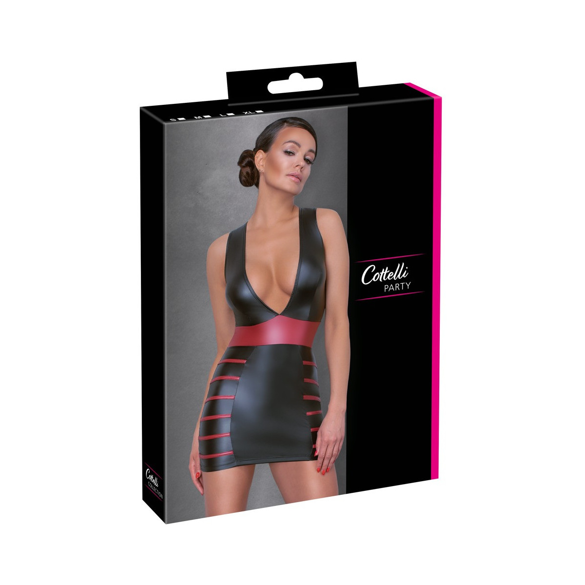 Abito corto aderente di Cottelli PARTY in look nero opaco con strisce laterali rosse nella parte della gonna e inserto in vita in rosso per accentuare la silhouette e le curve. Taglio extra basso a V sul davanti. Morbido e altamente elastico per un elevato comfort di vestibilità.