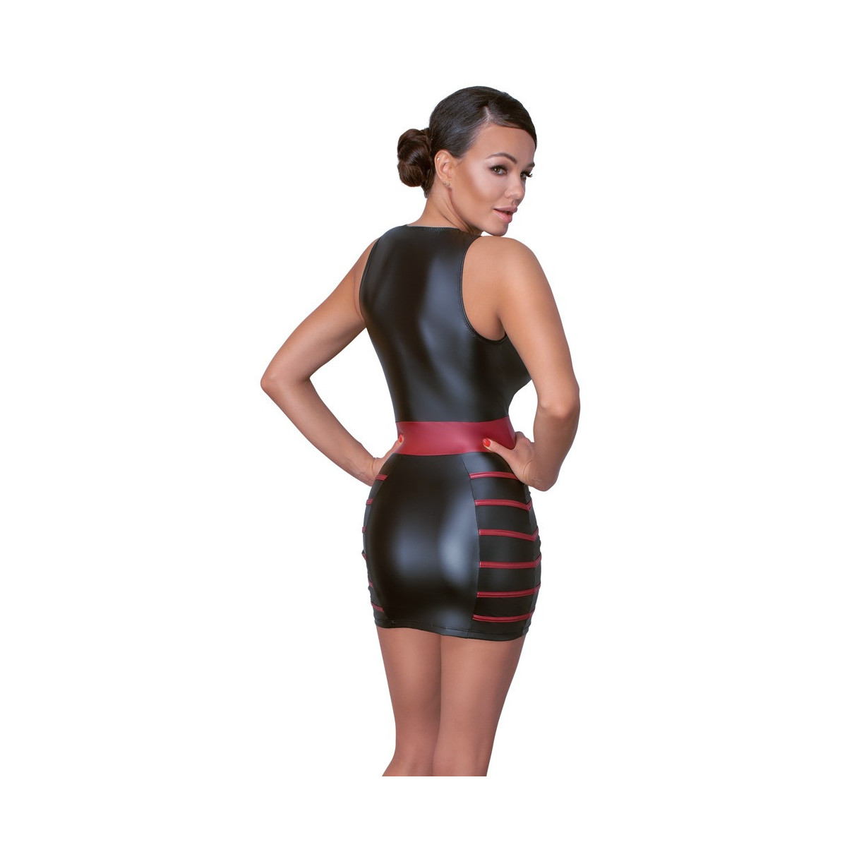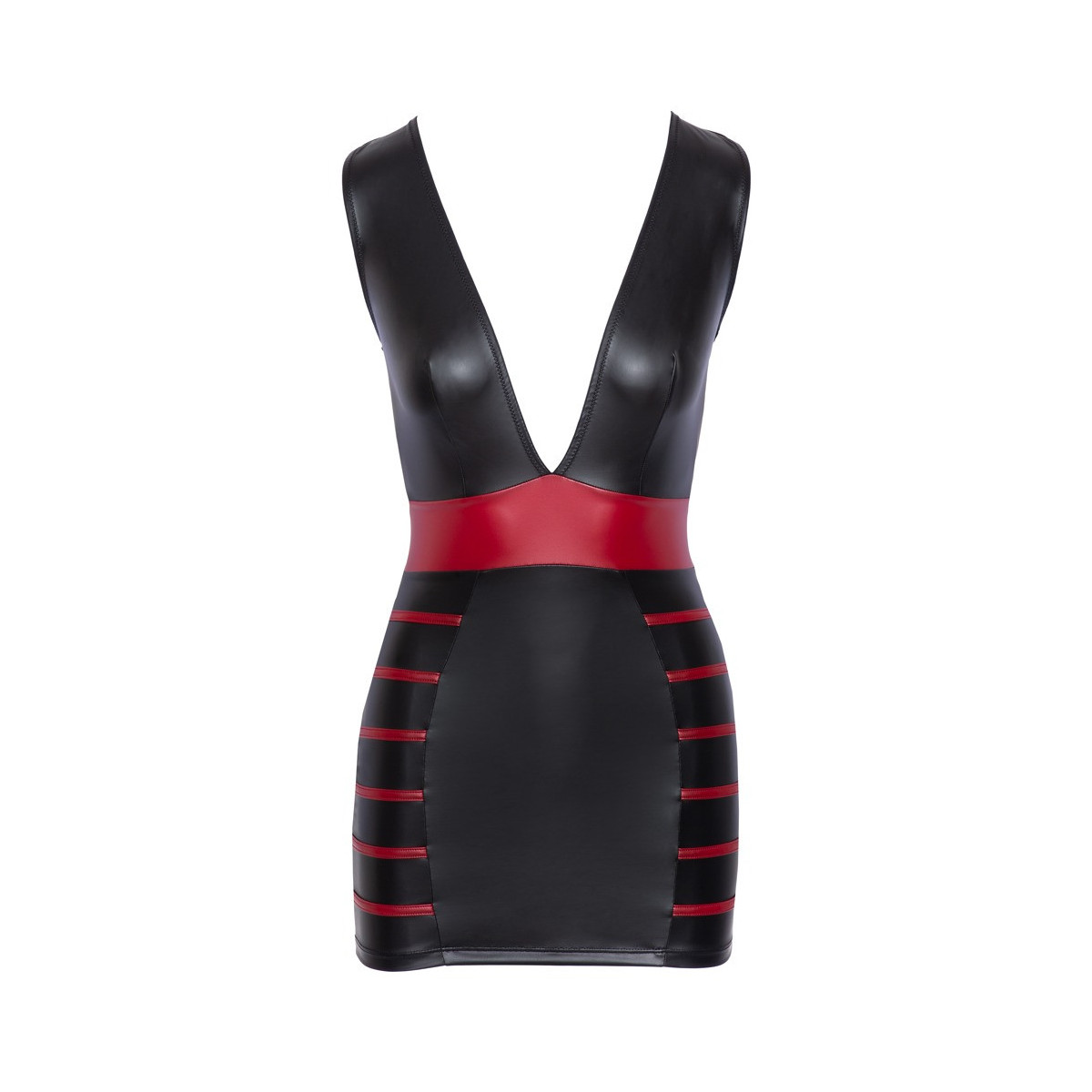Abito corto aderente di Cottelli PARTY in look nero opaco con strisce laterali rosse nella parte della gonna e inserto in vita in rosso per accentuare la silhouette e le curve. Taglio extra basso a V sul davanti. Morbido e altamente elastico per un elevato comfort di vestibilità.