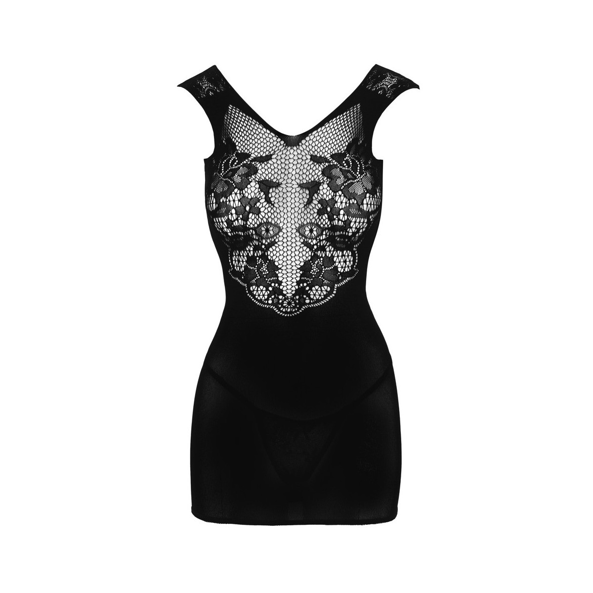 Miniabito scintillante con elaborato look a rete e pizzo sul davanti. Inoltre, la schiena incanta con una scollatura extra profonda con raffinati dettagli a strappo. E' incluso anche il perizoma coordinato. Senza cuciture e altamente elastico.