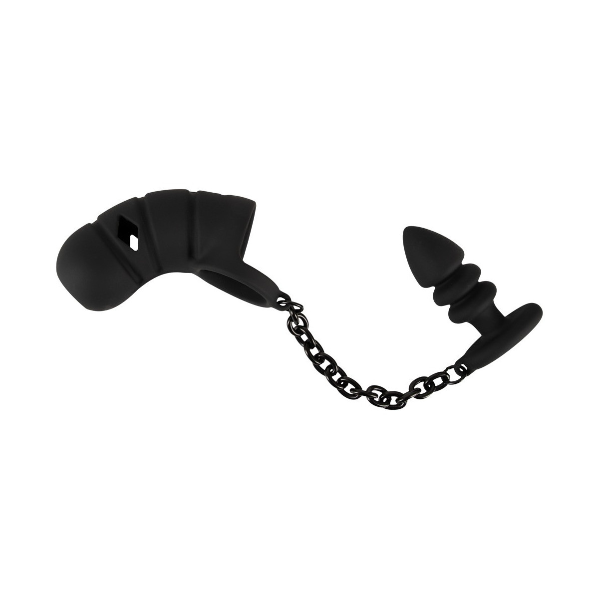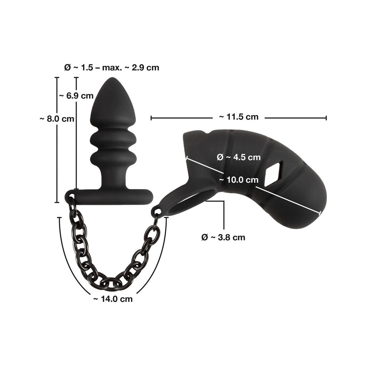 La gabbia per il pene con butt plug di Black Velvets combina una gabbia per il pene con un anello per i testicoli e la collega tramite una robusta catena al plug anale a coste. Oltre alla grande sensazione che si prova indossandolo, è anche una vista altamente eccitante e un accessorio eccitante per i giochi di controllo e di castità.