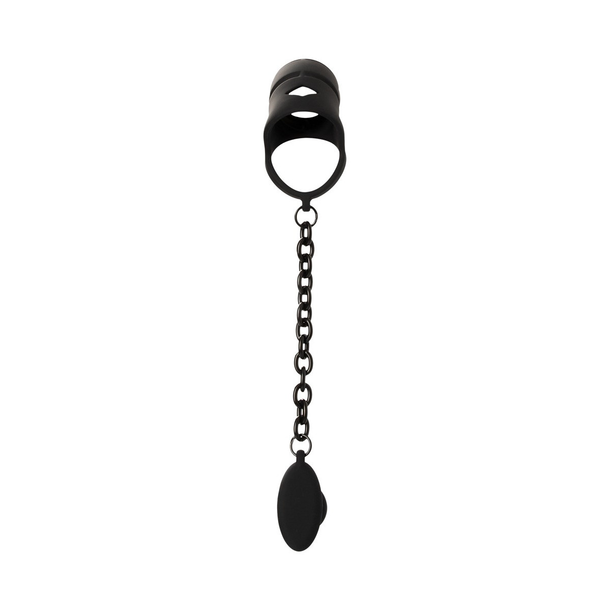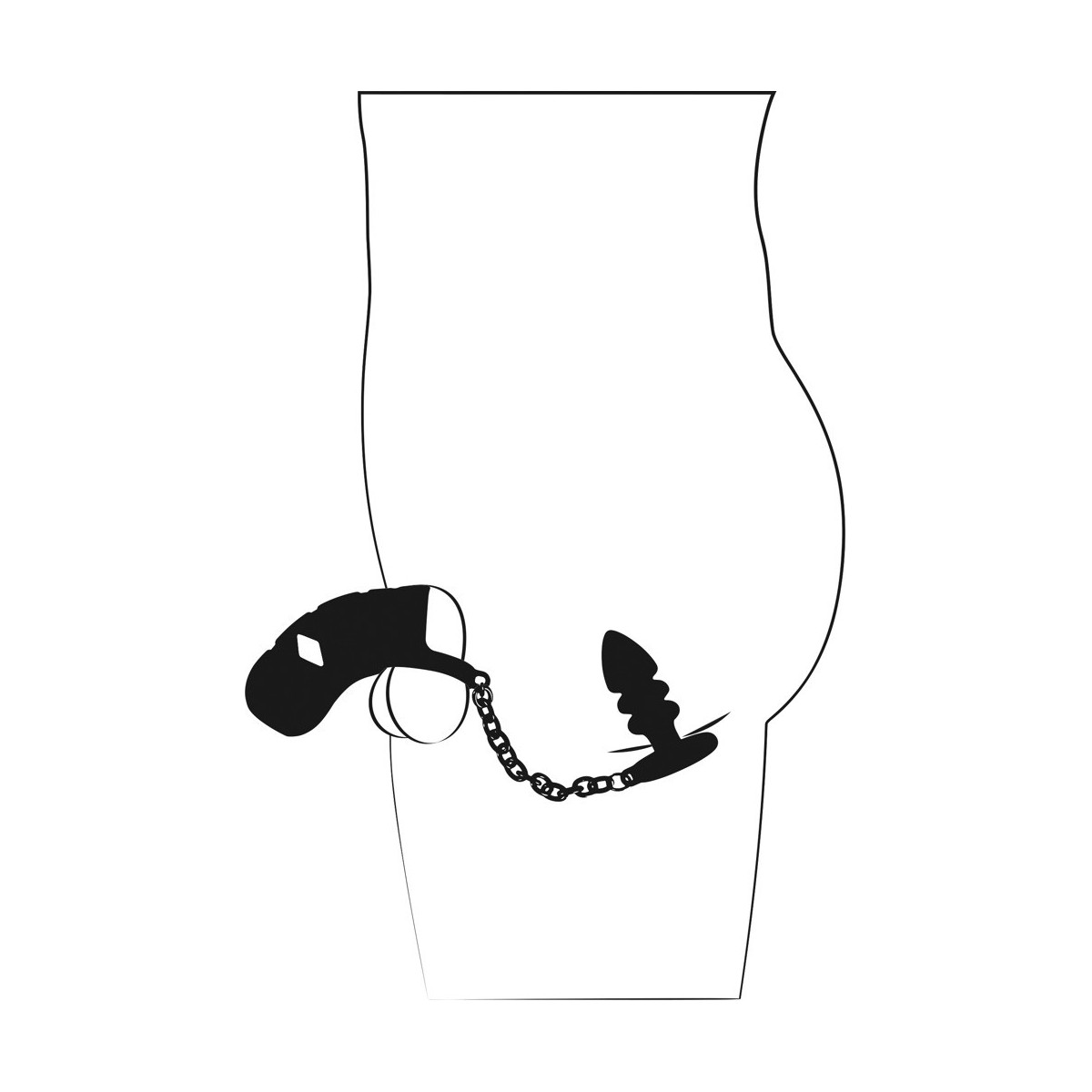 Il pene viene inserito nella gabbia in silicone flessibile, dalla forma anatomica ottimale, e l'anello elastico viene tirato sopra i testicoli in modo che il tutto si posiziona in modo antiscivolo. Il plug anale viene quindi inserito nell'ano. La catena di collegamento offre una trazione eccitante e sfrega in modo stimolante sul perineo quando viene indossata.