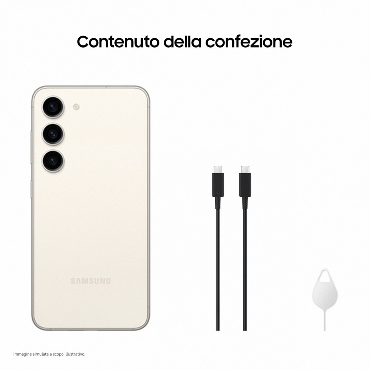 Samsung Galaxy S23 Display 6.1'' Dynamic AMOLED 2X, Fotocamera 50MP, RAM 8GB, 128GB, 3.900 mAh, Cream. Dimensioni schermo: 15,5 cm (6.1"), Risoluzione del display: 2340 x 1080 Pixel, Tipo di display: Dynamic AMOLED 2X. Famiglia processore: Qualcomm Snapdragon, Modello del processore: 8 Gen 2. Capacità della RAM: 8 GB, Capacità memoria interna: 128 GB. Risoluzione fotocamera posteriore (numerico): 50 MP, Tipo di fotocamera posteriore: Tripla fotocamera. Capacità della scheda SIM: Tripla SIM. Sistema operativo incluso: Android 13. Capacità della batteria: 3900 mAh. Colore del prodotto: Crema. Peso: 168 g