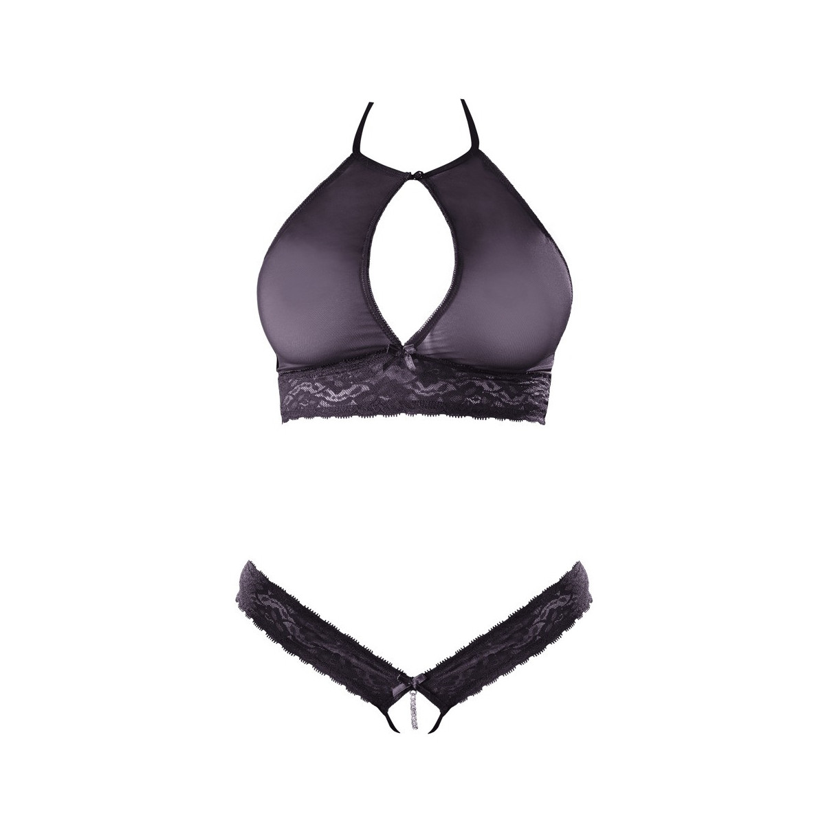 Questo nobile set convince con il pizzo delicato e gli strati trasparenti sopra i seni. Ideale da indossare in una notte eccitante o stuzzicante sotto la camicia hervorlugend durante il giorno. Il perizoma consiste in una fascia di pizzo intorno alla vita ed è ouvert nel cavallo. Inoltre, una catena stimola nel cavallo.