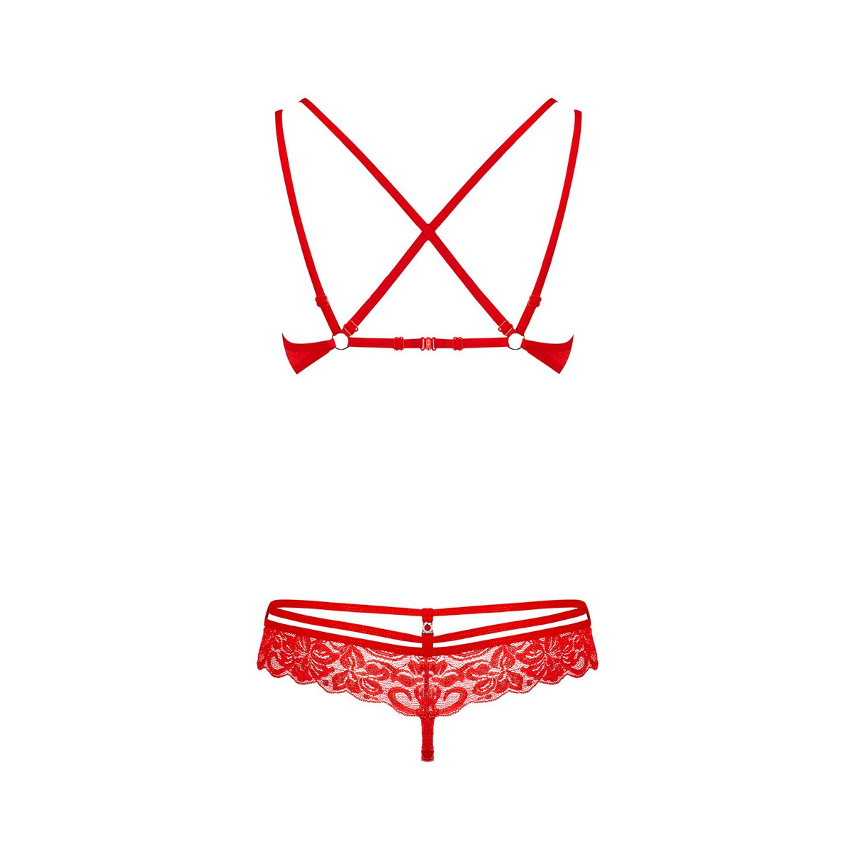 Il bellissimo ensemble è composto completamente di pizzo e brilla con i piccoli elementi di strass su reggiseno e perizoma. I nastri decorativi e i doppi cinturini sono un'attrazione per chi li indossa e per chi li guarda.