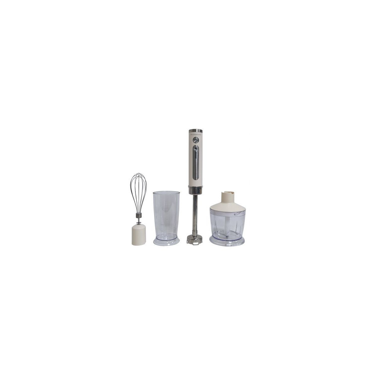 Set completo di sbattitore, tritatutto, frullatore a immersione e bicchiere graduato. Elegante e comodo per la preparazione di ogni tuo piatto.