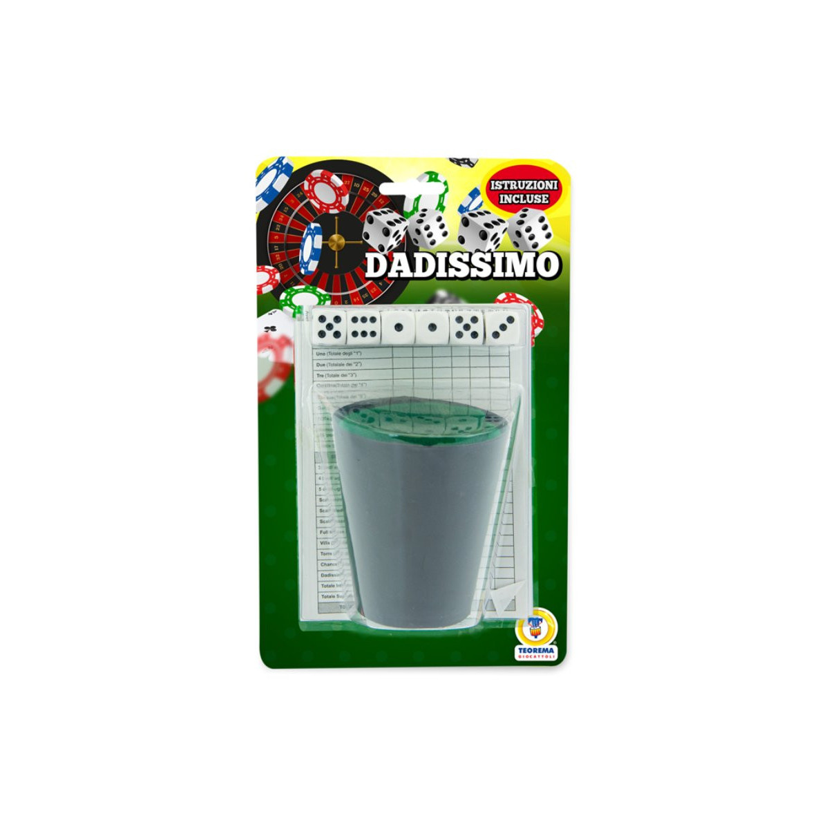 - Dimensioni: bicchiere per dadi: 9,5 x 8 x 8 cm. Dadi: 15 x 15 x15 mm.