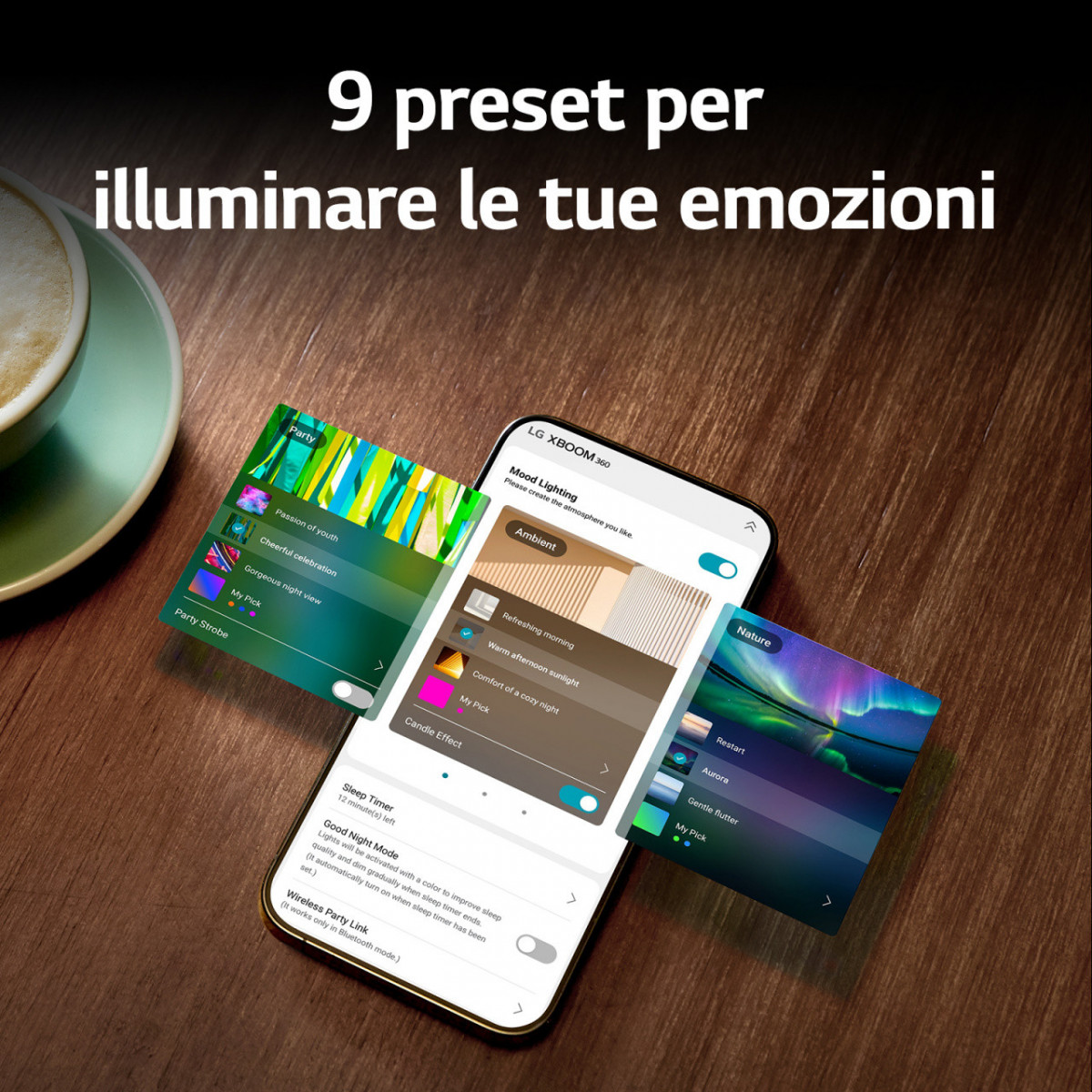 Scarica l'app LG XBOOM sul tuo smartphone Android o iOS e personalizza numerosi aspetti del tuo speaker XBOOM 360. Puoi cambiare l'equalizzazione della musica a tuo piacimento, gestire l'illuminazione emozionale scegliendo i colori della luce e gli effetti e, infine, con le funzioni DJ puoi animare le tue serate riproducendo effetti audio e mixando la musica direttamente dal tuo smartphone.